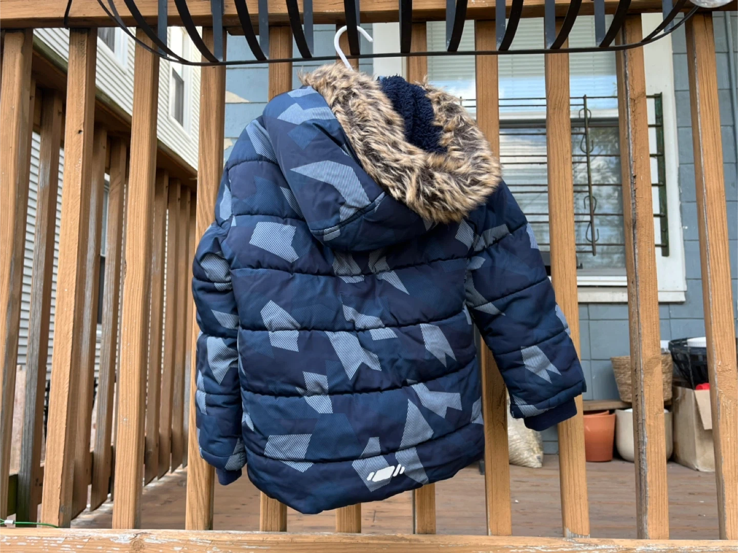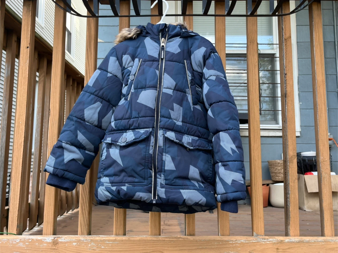 Boys' puffer jacket in size 4. It is blue with a geometric pattern. The jacket has a faux fur trimmed hood and pockets. Great for keeping warm!