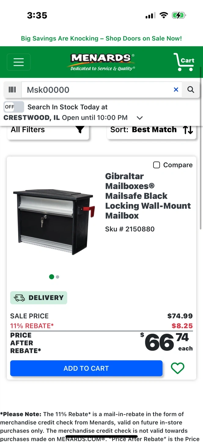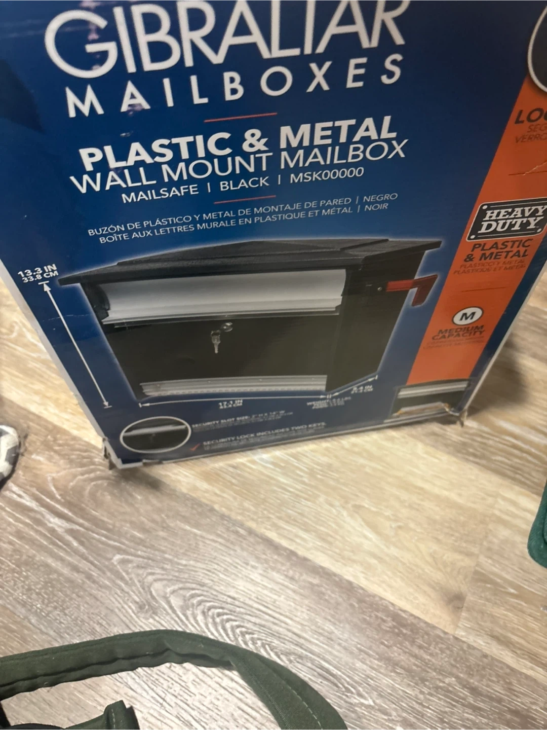20Selling a Gibraltar Mailboxes plastic and metal wall mount mailbox. It's the MailSafe model in black, MSK00000. The box is included and it has a security lock with two keys. It's heavy duty and medium capacity. Constructed from heavy-duty aluminum and plastic materials to protect from impact and rust Medium capacity accommodates average volume mail deliveries Textured black powder-coated finish to withstand rust and elements Outgoing mail flag assembly required Concealed locking compartment to protect from theft; includes 2 keys for household access Mounting hardware sold separately Mail delivery slot: 14" W x 2" H Internal pickup tray stores outgoing mail out of sight New $75.00
