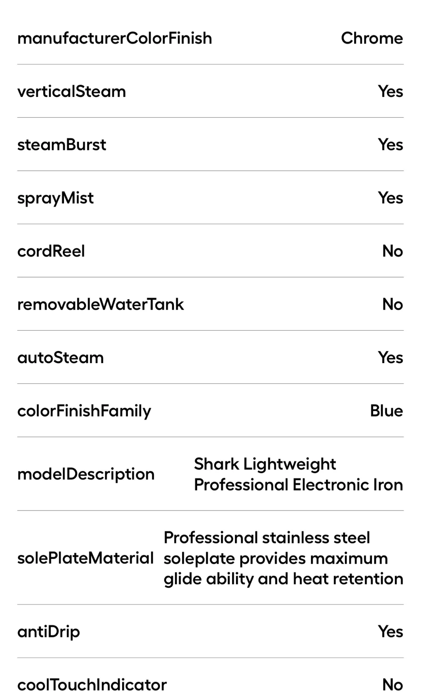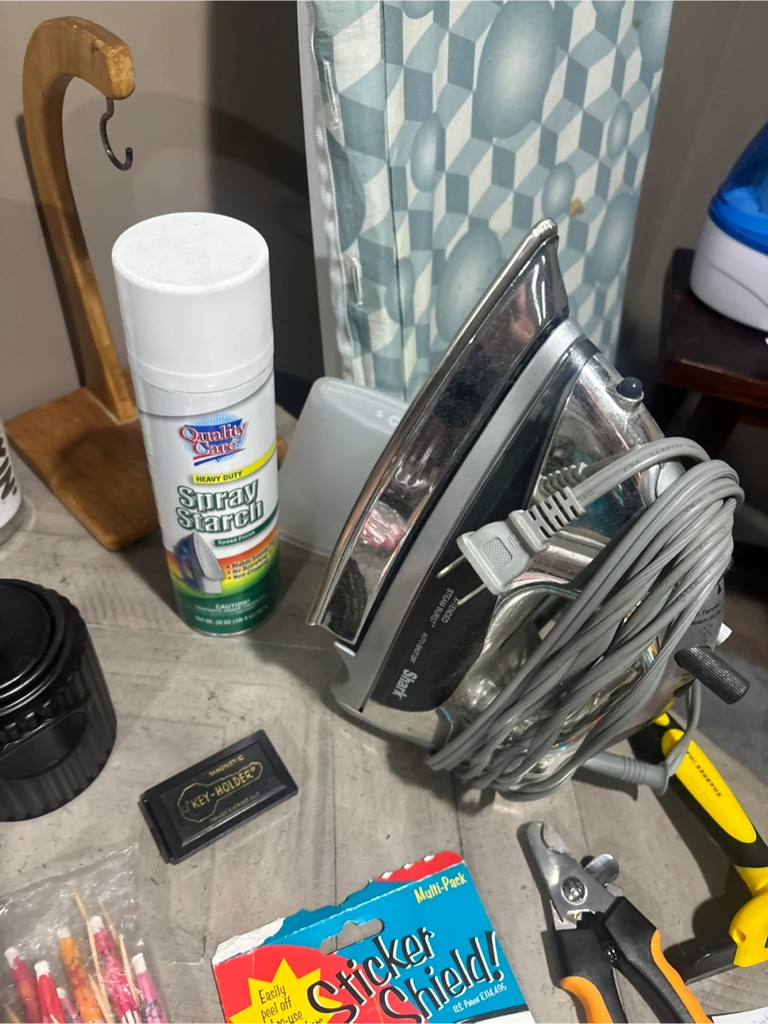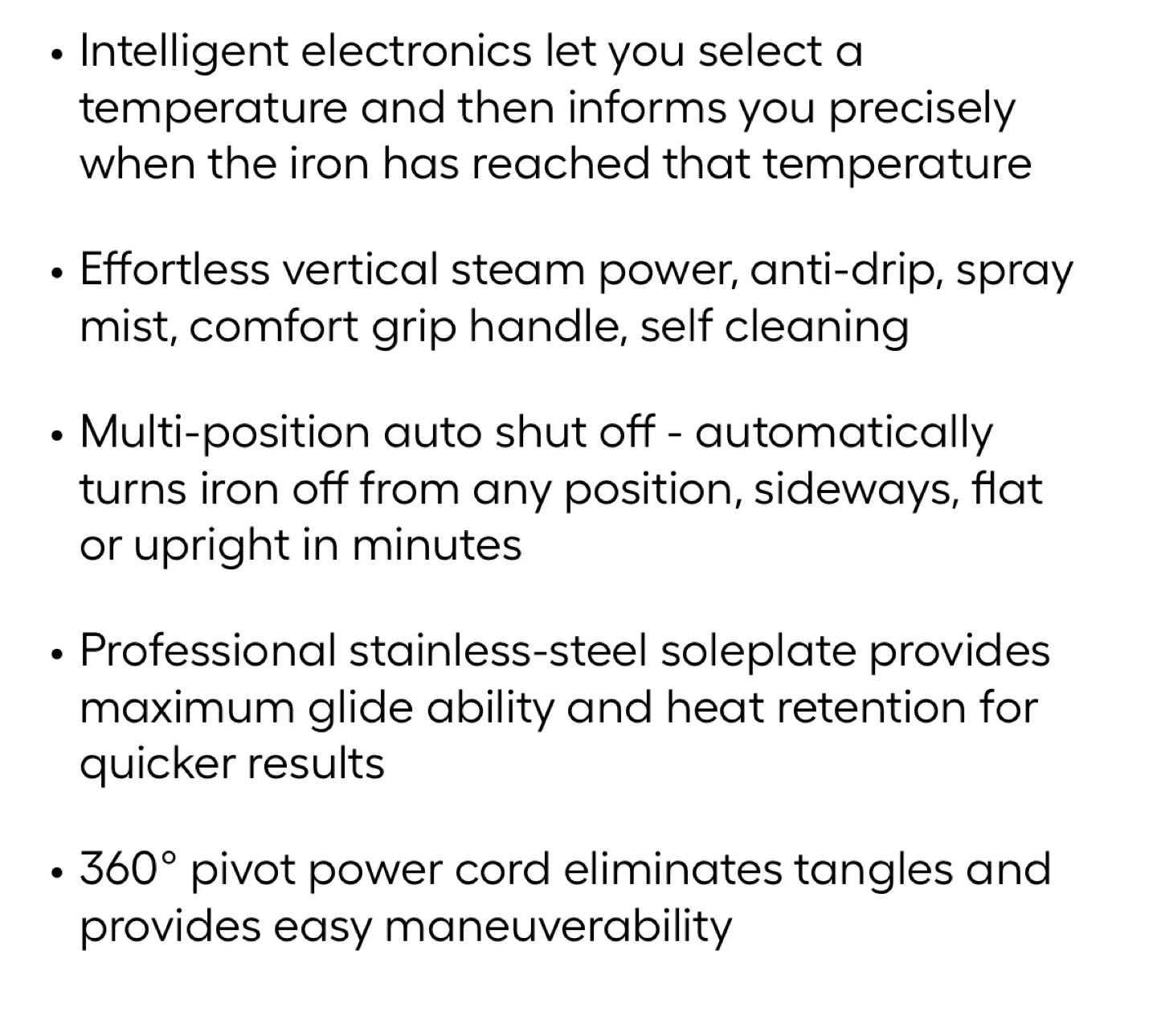 I'm selling a Shark Auto-Steam Iron with Auto Shut-Off. It features intelligent electronics that let you select a temperature and then informs you precisely when the iron has reached that temperature. It also features effortless vertical steam power, anti-drip, spray mist, comfort grip handle, and self cleaning. The professional stainless-steel soleplate provides maximum glide ability and heat retention for quicker results. It also has a multi-position auto shut off that automatically turns the iron off from any position, sideways, flat, or upright in minutes Includes is ironing board and can of starch spray.
