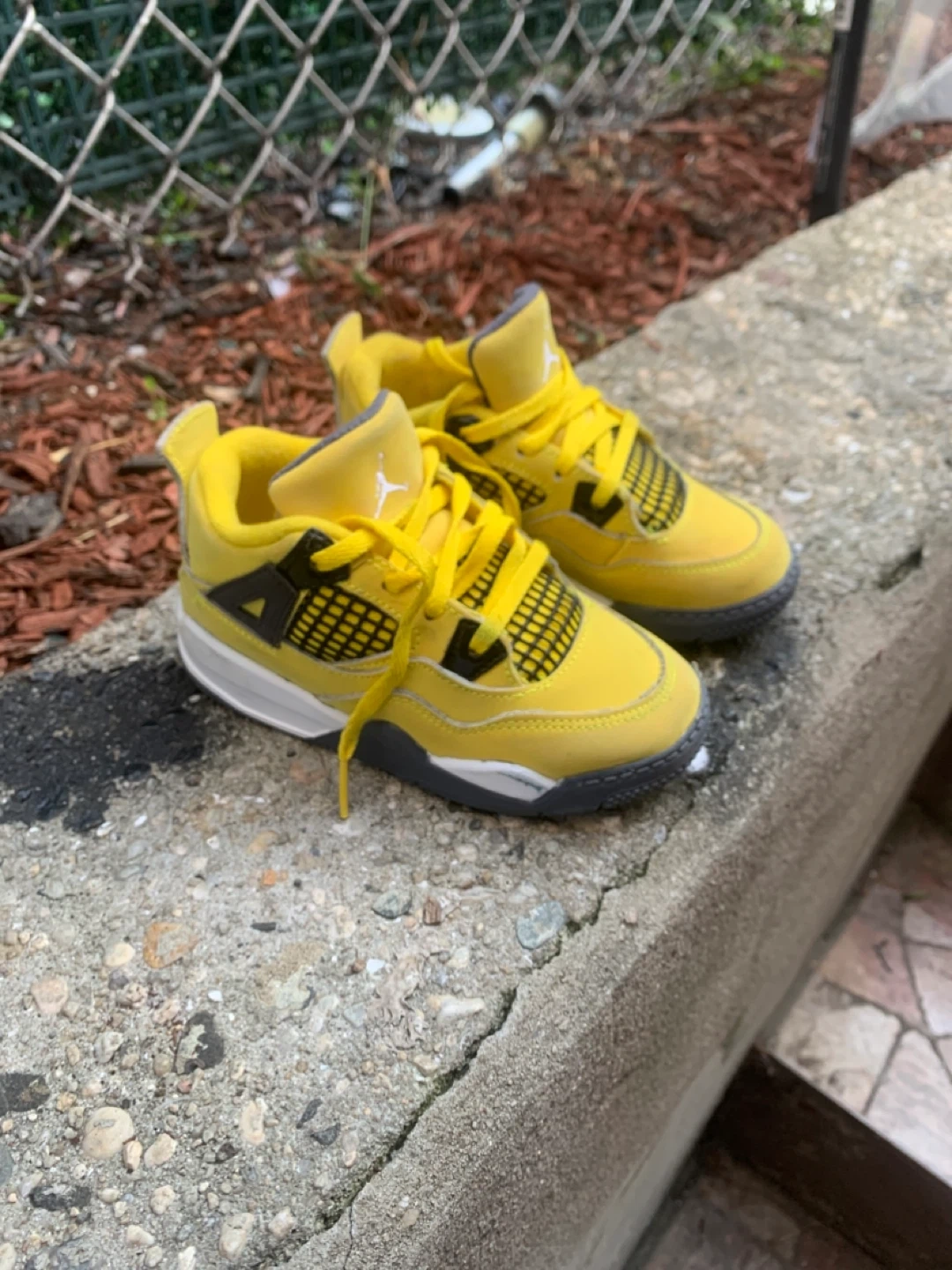 Selling a pair of yellow Air Jordan 4 sneakers for kids. These shoes are in great condition and ready for a new home! They feature the classic Air Jordan design with a vibrant yellow colorway.