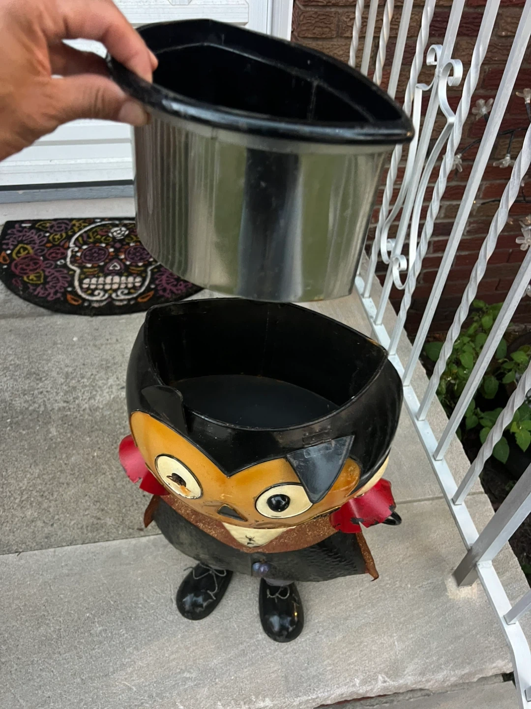 This is a vintage Halloween decoration that can be used as a candy bucket. It is designed as a vintage vampire character with a black and orange head, a gold and black cape, and black shoes. It has some wear and tear but is still in good condition for its age