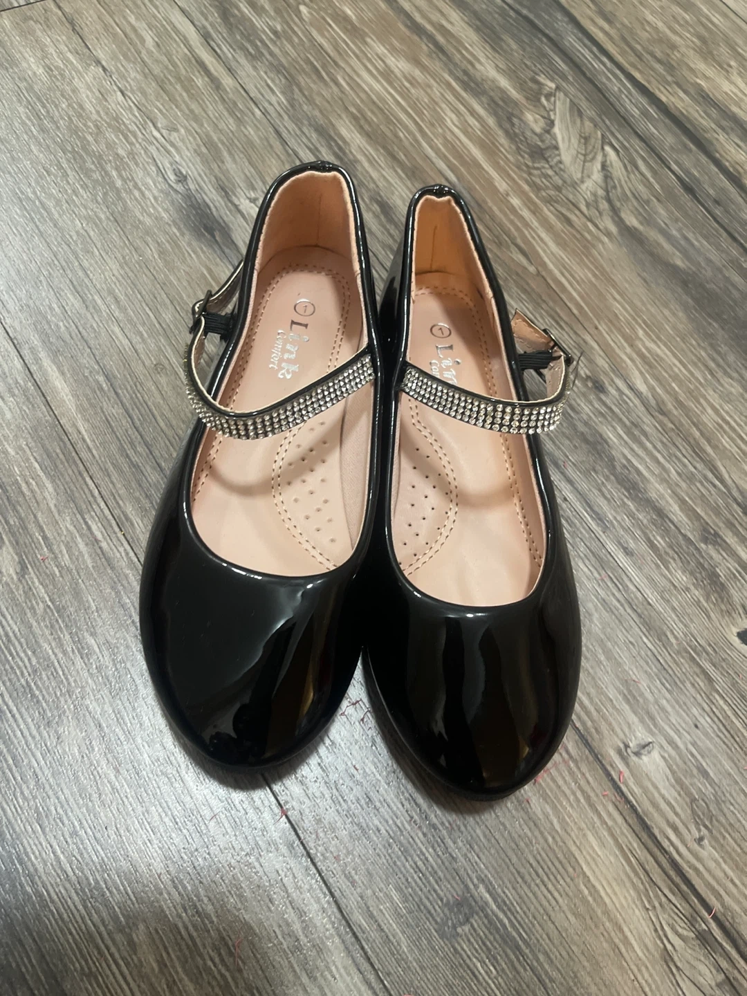 Cute pair of Link brand black patent leather shoes for girls. They feature a strap with sparkly rhinestones. The size is 1. No box