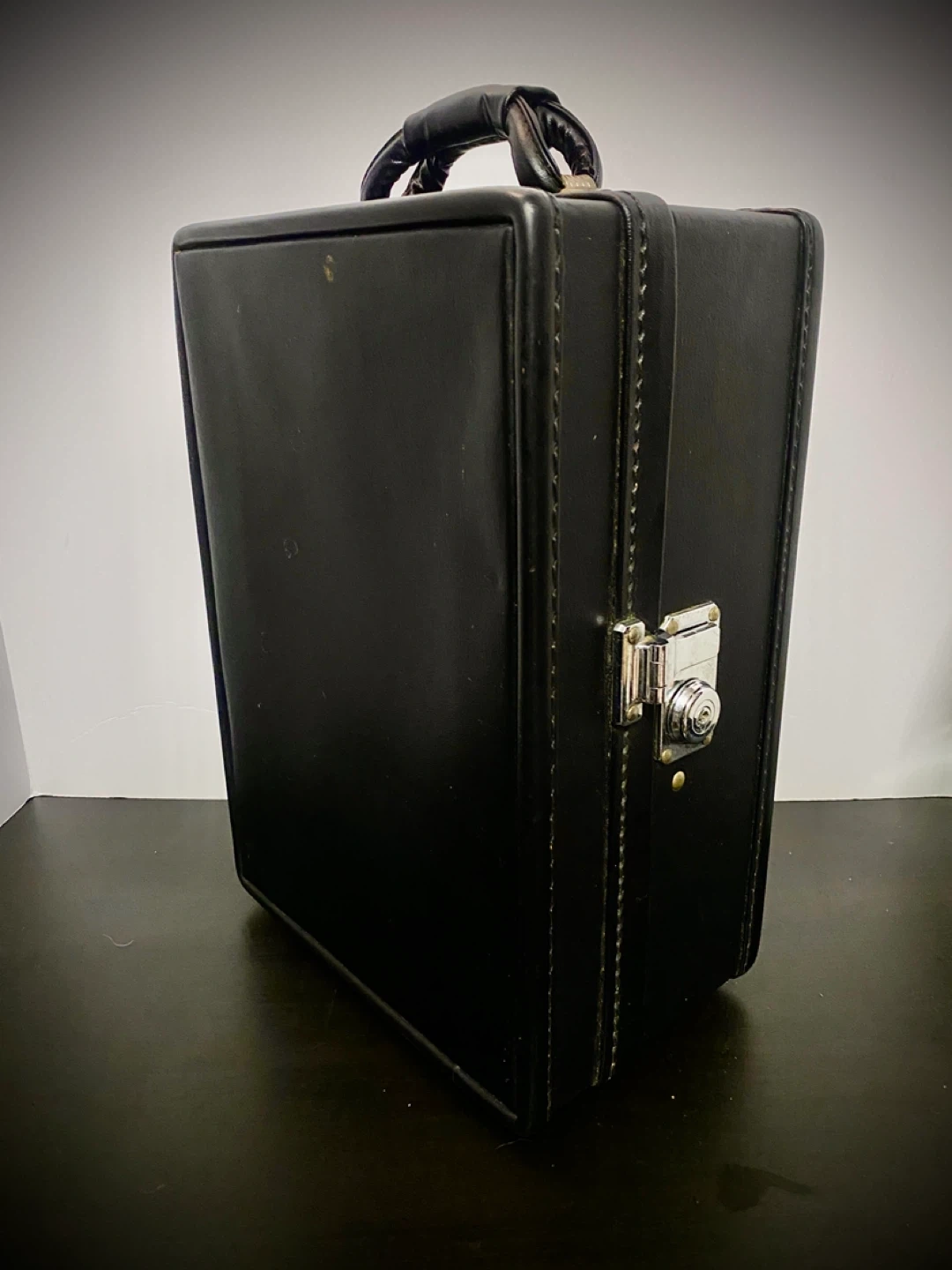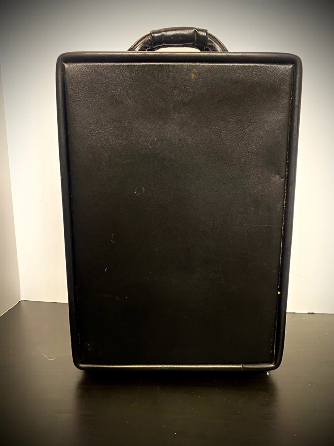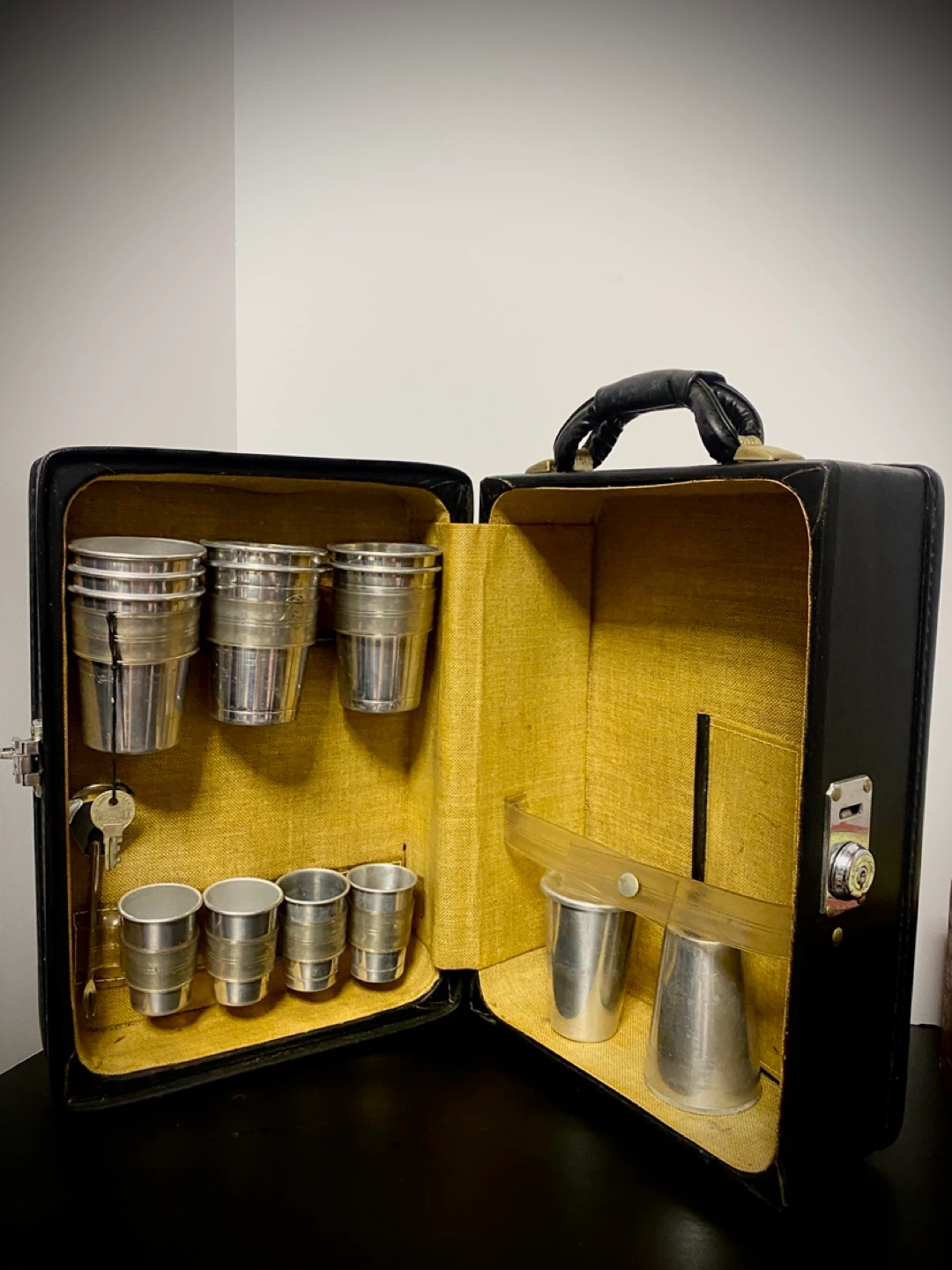Cool find!!! Selling a vintage MCM black bartender travel case! It features a handle, a locking mechanism with a key, (it works!) and interior compartments for storing bar tools. The case includes metal shot glasses and cocktail cups. Perfect for a vintage bar ware collector or someone who enjoys making cocktails on the go!