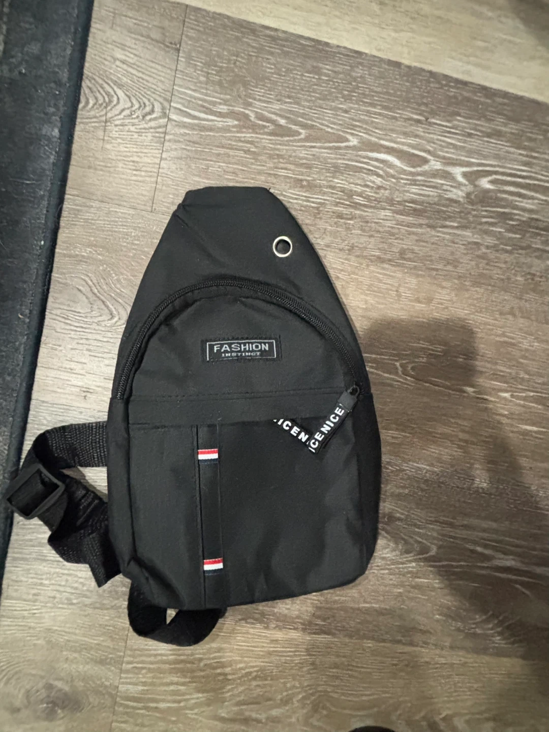 20I'm selling a black sling bag! It features a "FASHION INSTINCT" logo and a zipper pull that says ".ICEN.ICENICE". It's in great condition and ready for a new home