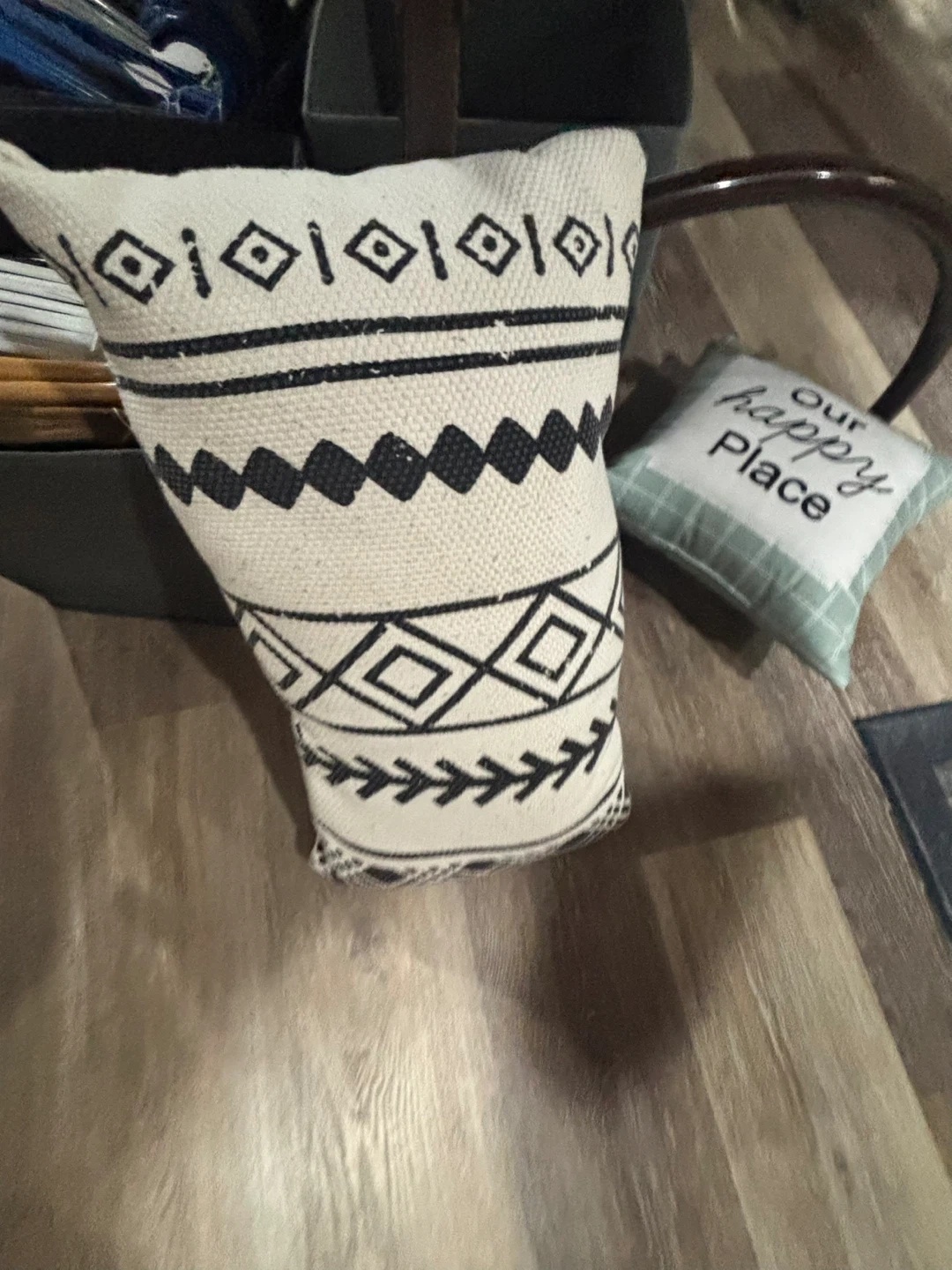 Cute decorative pillow that says 'Our happy place' on it! And boho style cream long pillow with black pattern print. Both $5.00
