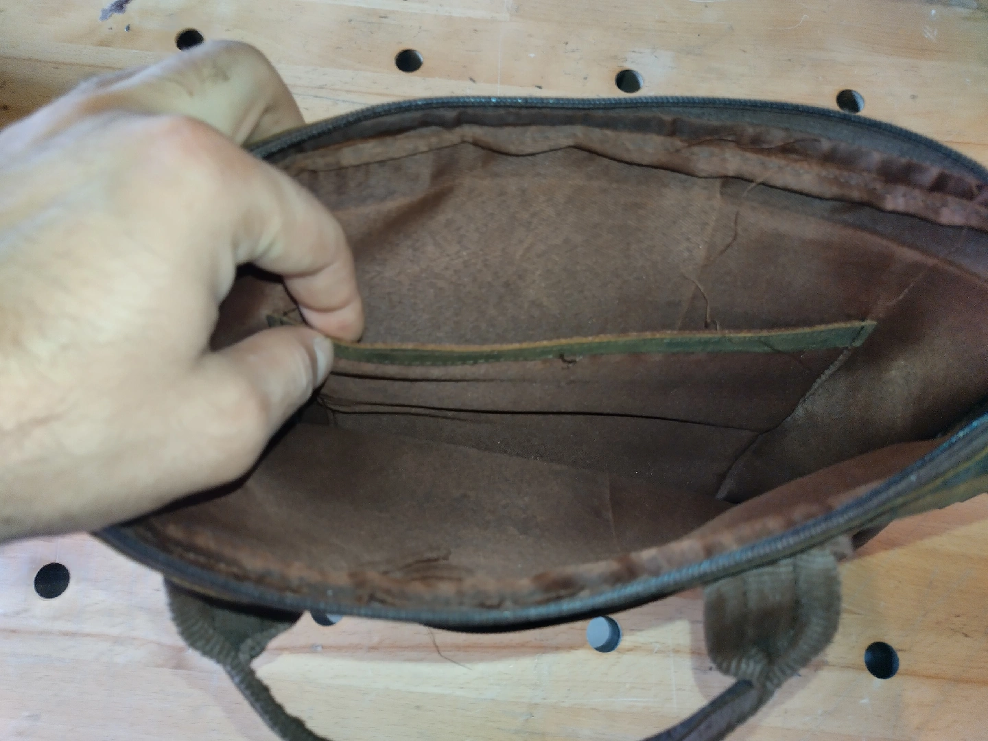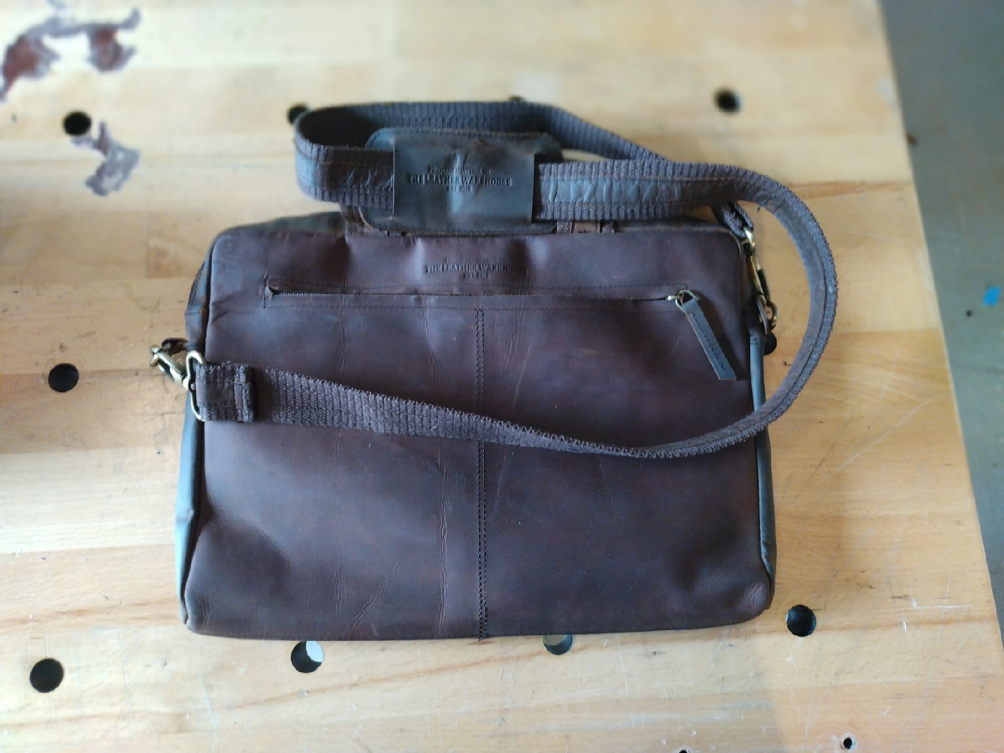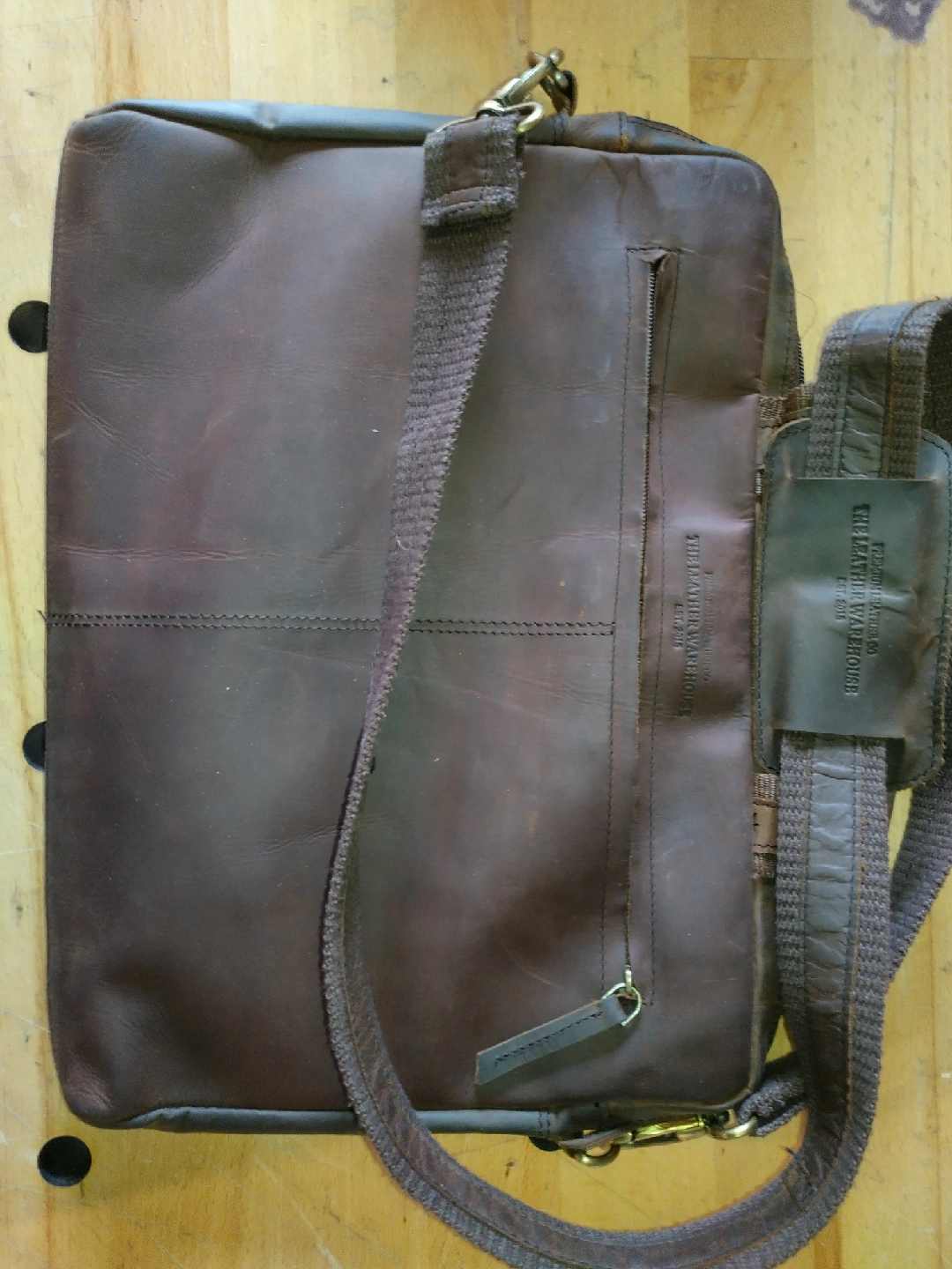 60Here's a nice brown leather messenger bag from The Leather Warehouse. It has a shoulder strap and a zippered pocket on the outside. It's in used condition with some wear and tear, but overall it's a great bag!