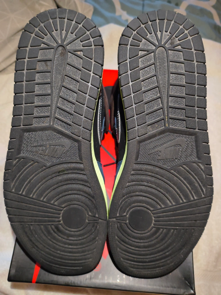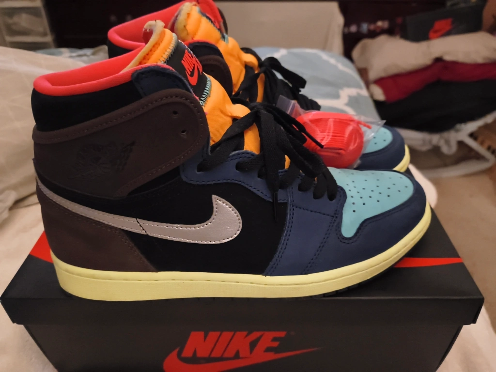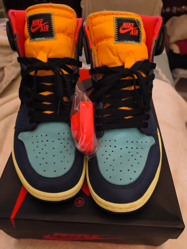 10Selling a pair of Nike Air Jordan 1 High OG Biohack sneakers. They are in great condition and come with the original box. These shoes feature a unique colorway with a mix of blue, black, brown, and yellow accents. Perfect for any sneaker enthusiast! worn 2 or 3 times extra pair of laces