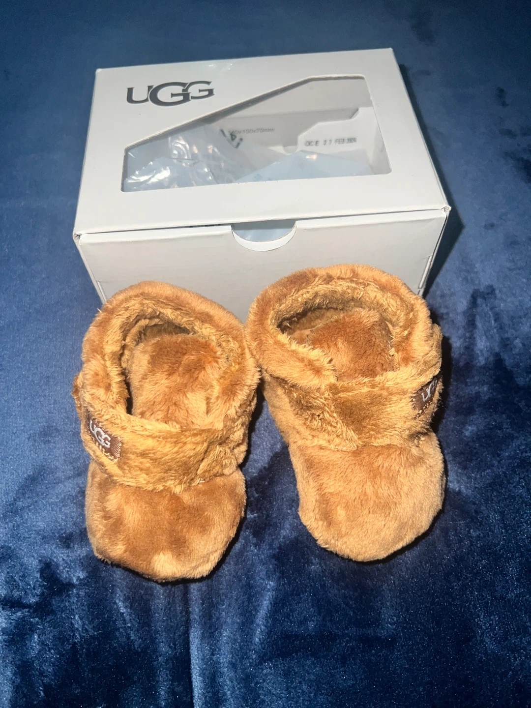 These UGG Baby Bixbee booties are super cute and cozy for your little one! They are a soft brown color and come with the original box. Perfect for keeping tiny toes warm and snug!