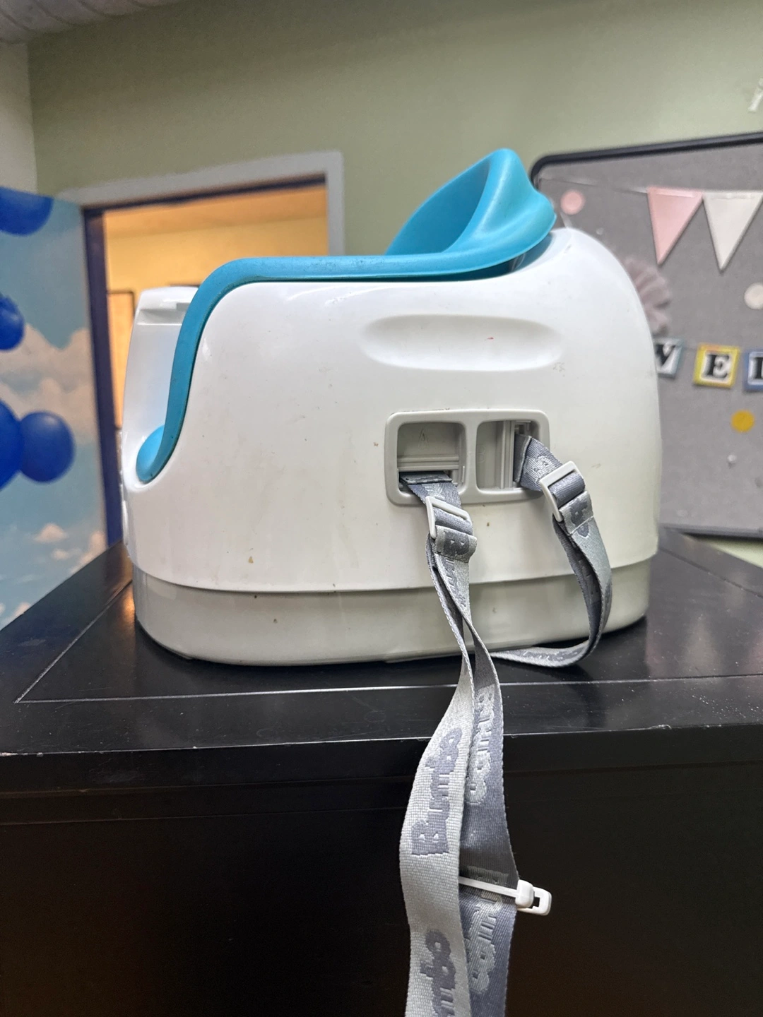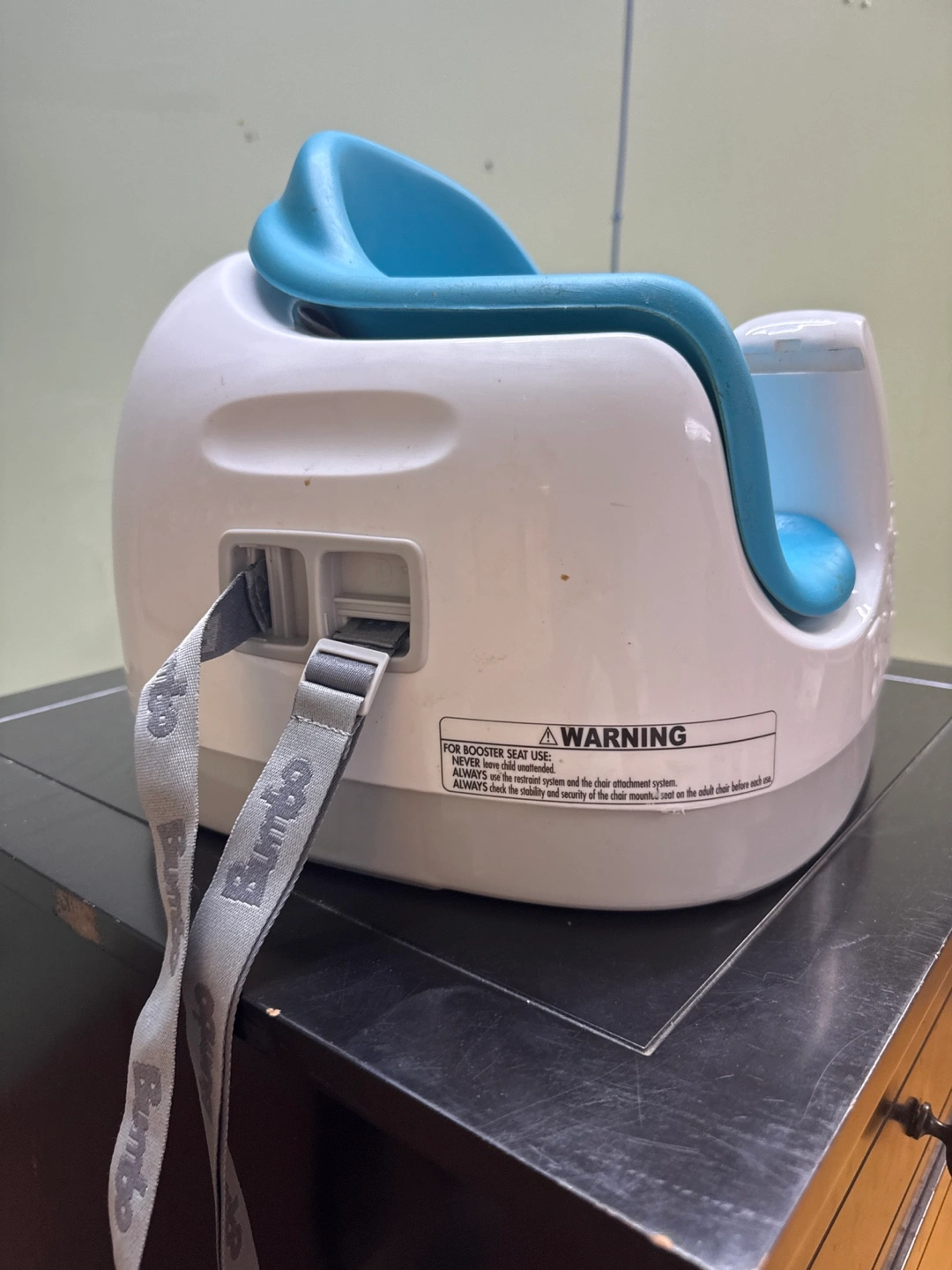Selling a Bumbo booster seat in white and blue! It's perfect for toddlers who are ready to sit at the table with the family. It has straps to secure it to a chair and a comfortable seat for your little one