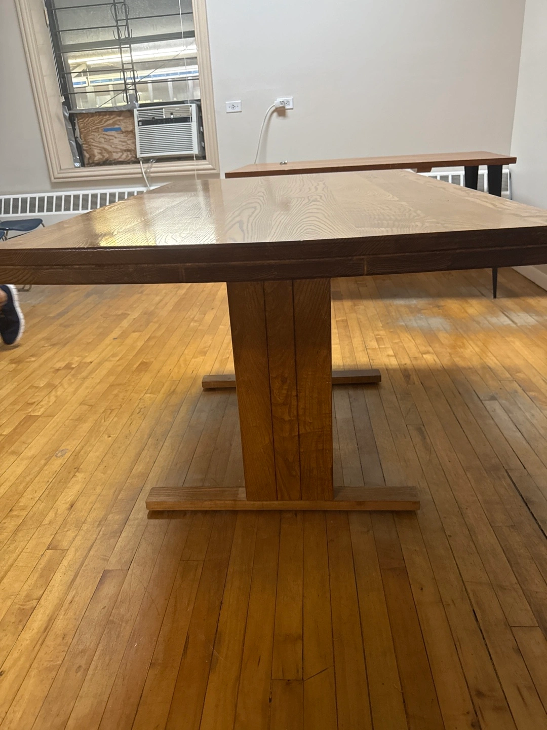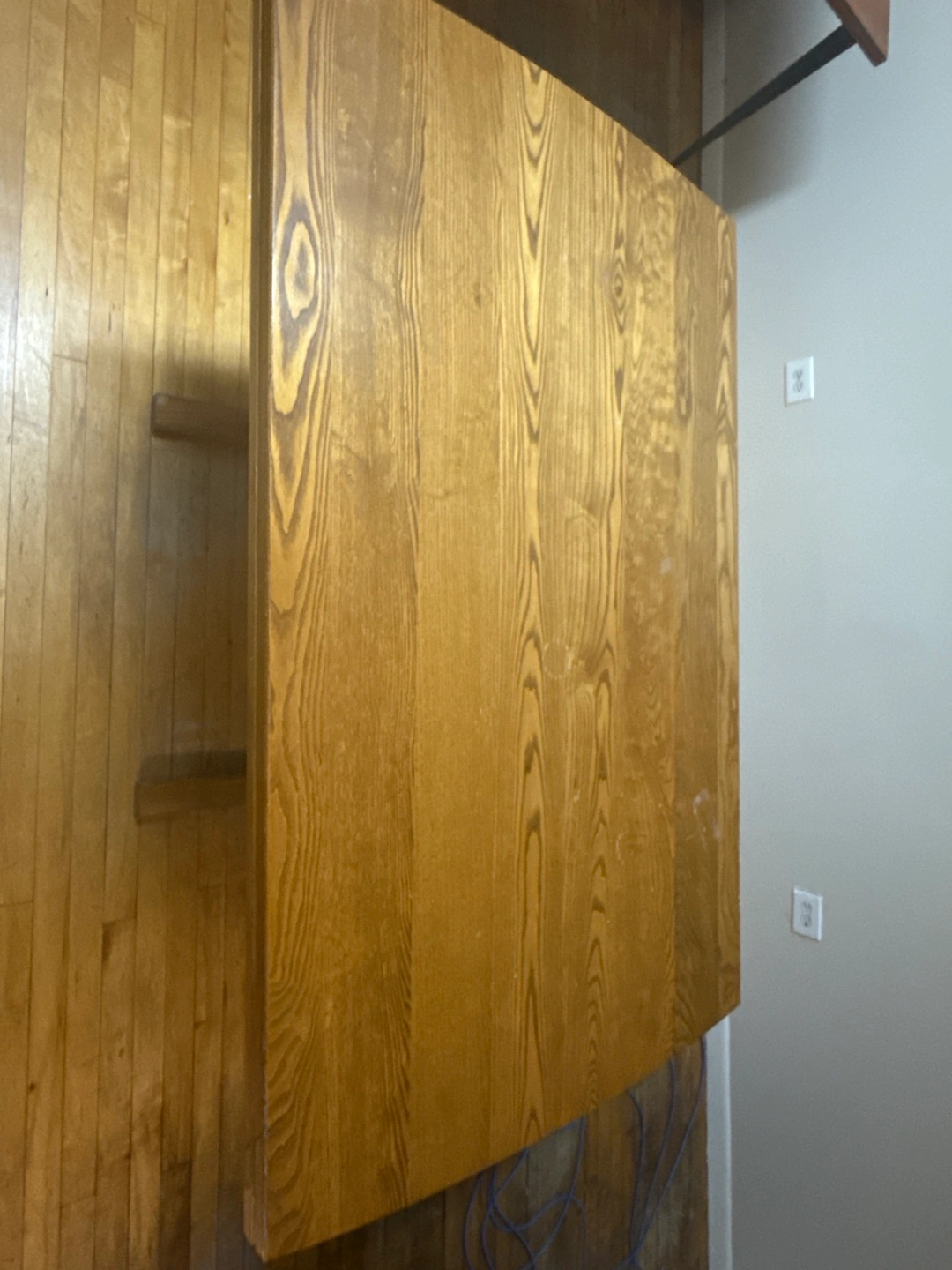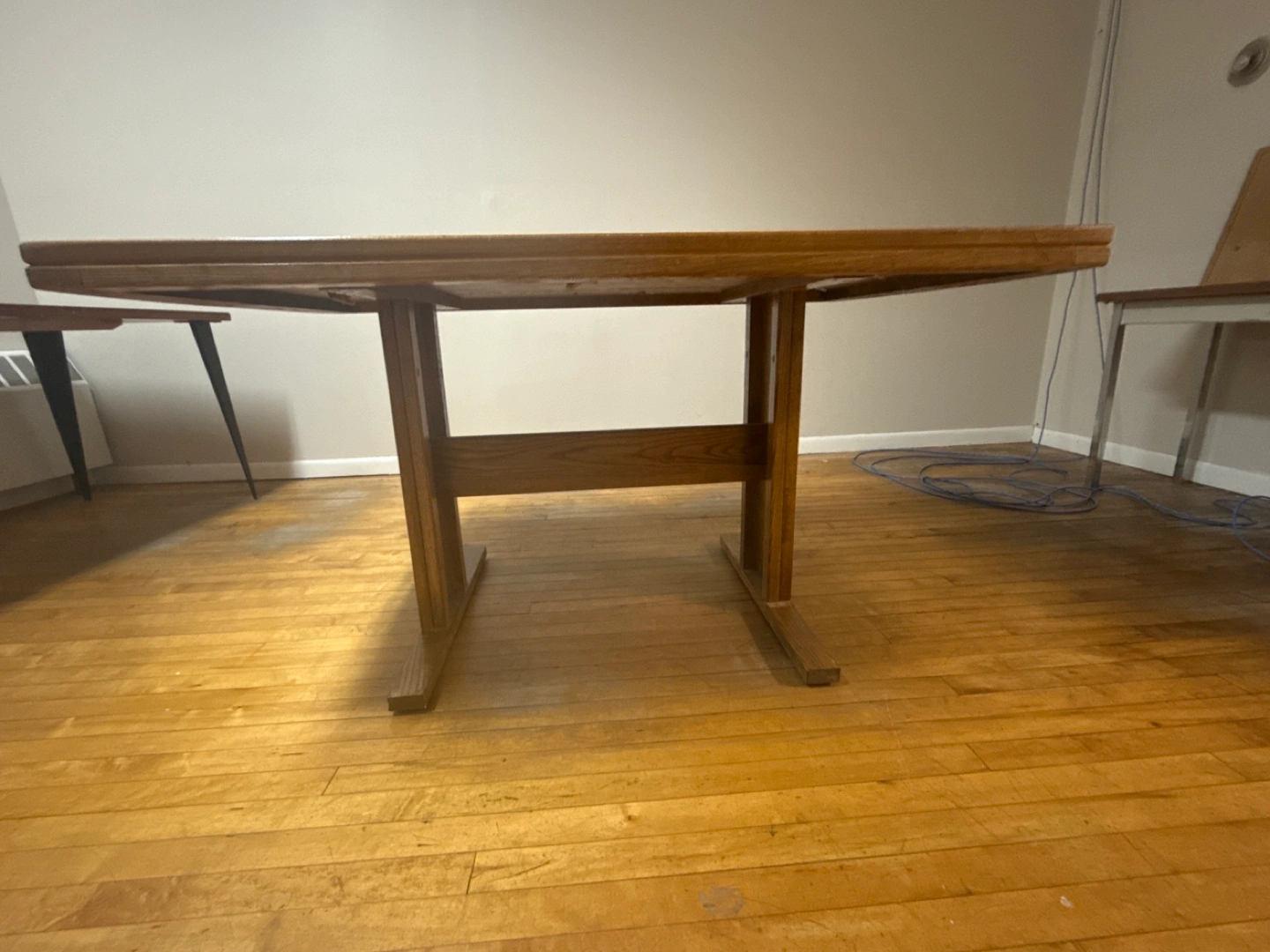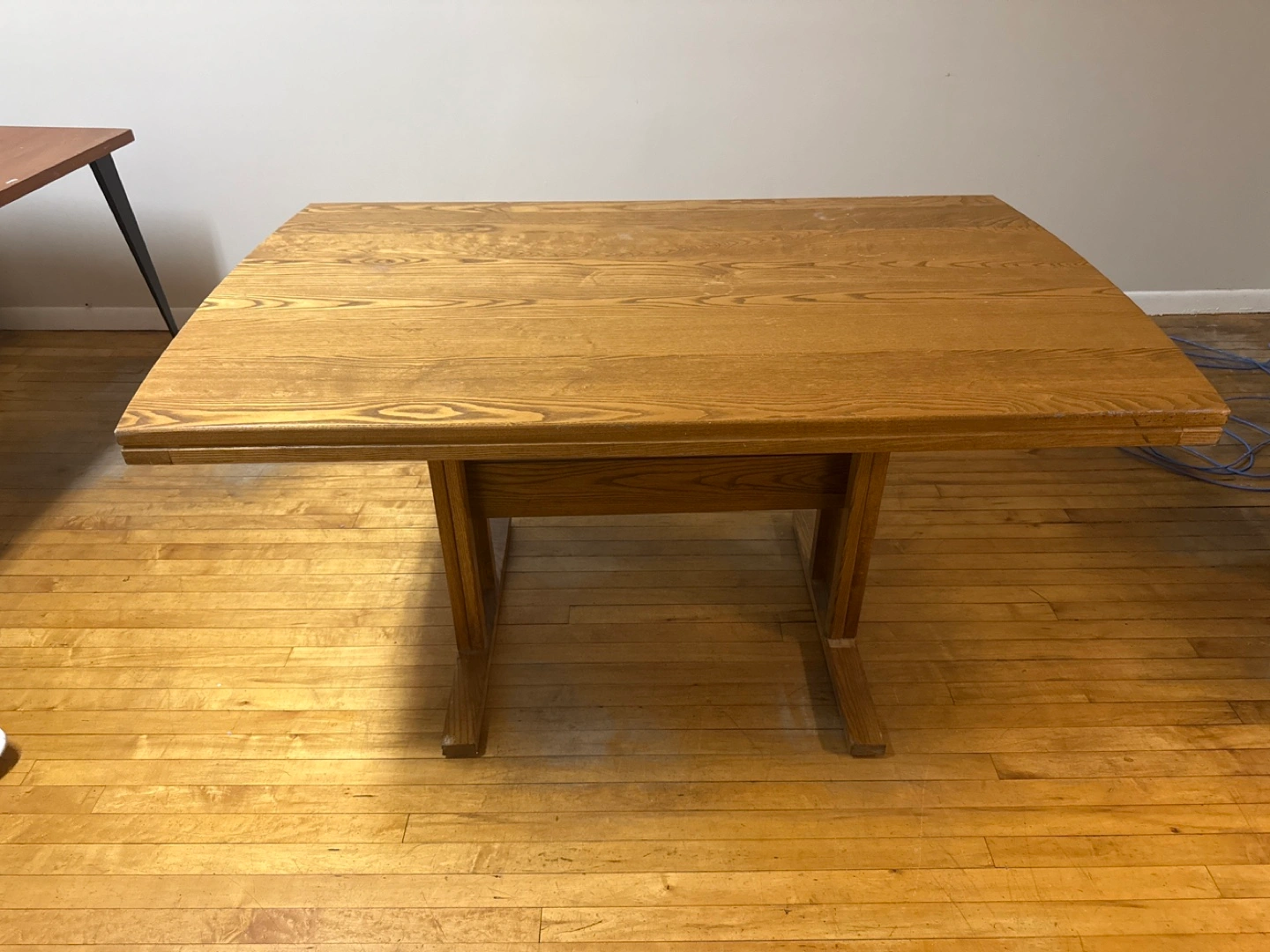 Selling a wooden dining table. It's in good condition and ready for a new home! It has a sturdy base and a smooth top surface. Perfect for family dinners or gatherings with friends. 59 1/2 inches long 36 inches wide 30 inches high.