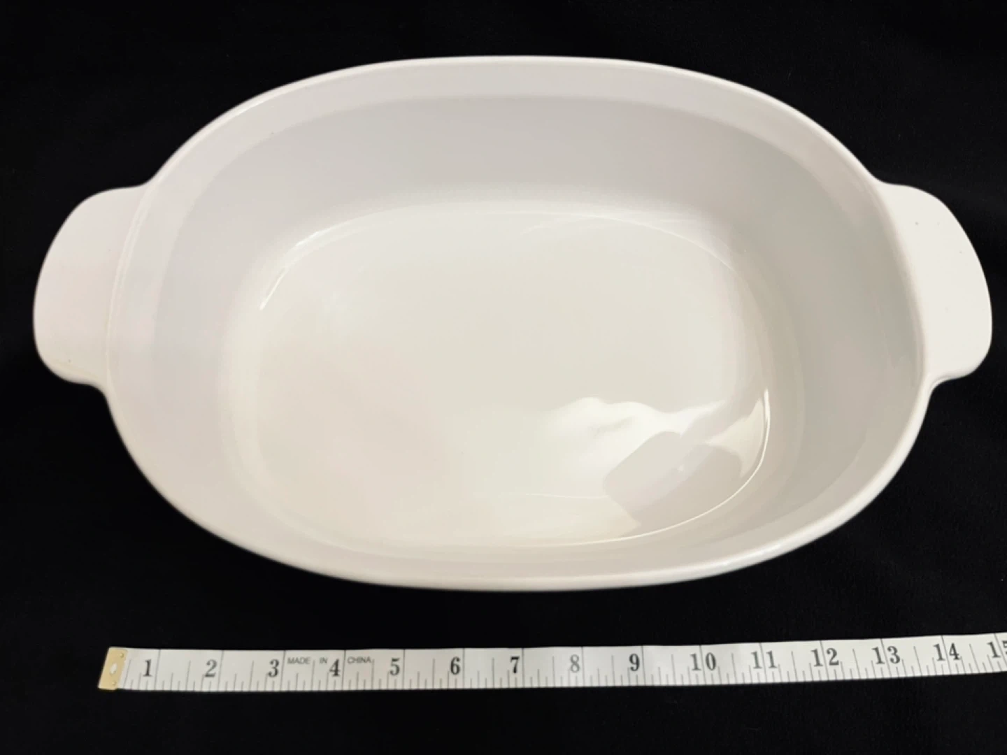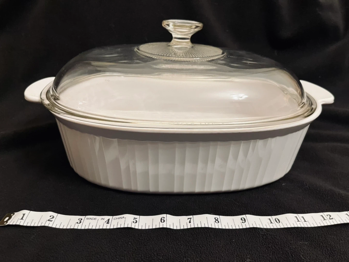 4L vintage, gently used Corning Ware casserole dish with a clear glass Pyrex lid. Large white dish with ribbed sides. It measures approximately 12 inches in length. Perfect for baking and serving!