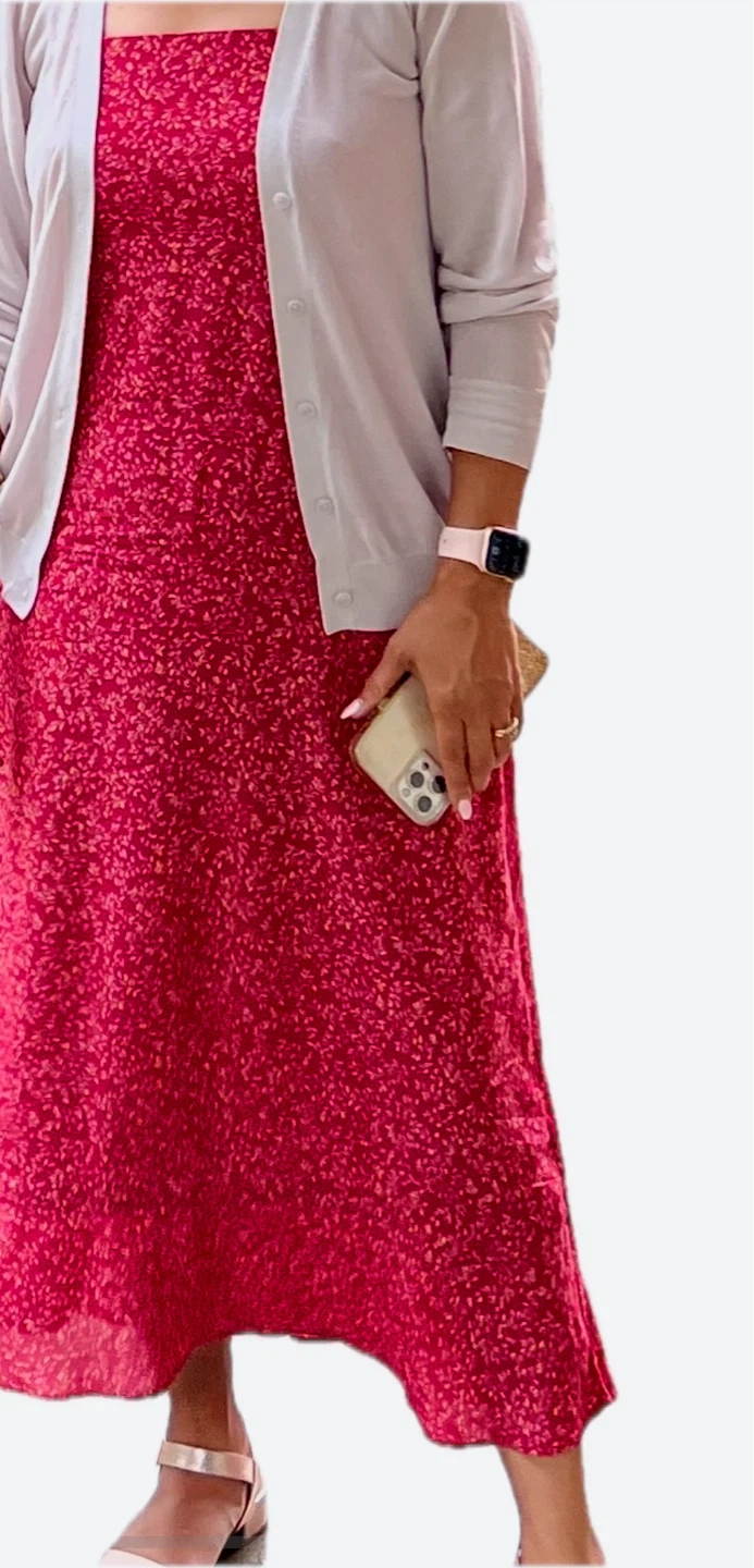 334Selling a cute GAP dress! It's a size 6 and has a lovely red floral pattern. The shell is 100% rayon, with the upper body lining also rayon. The lower body lining is 100% cotton, and the lining is 100% polyester