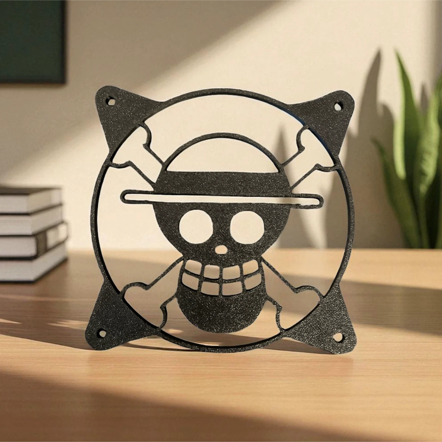 This is a custom 120mm fan grill cover featuring the Straw Hat Pirates logo from One Piece! It's a unique way to show off your love for the series while adding some flair to your computer setup
