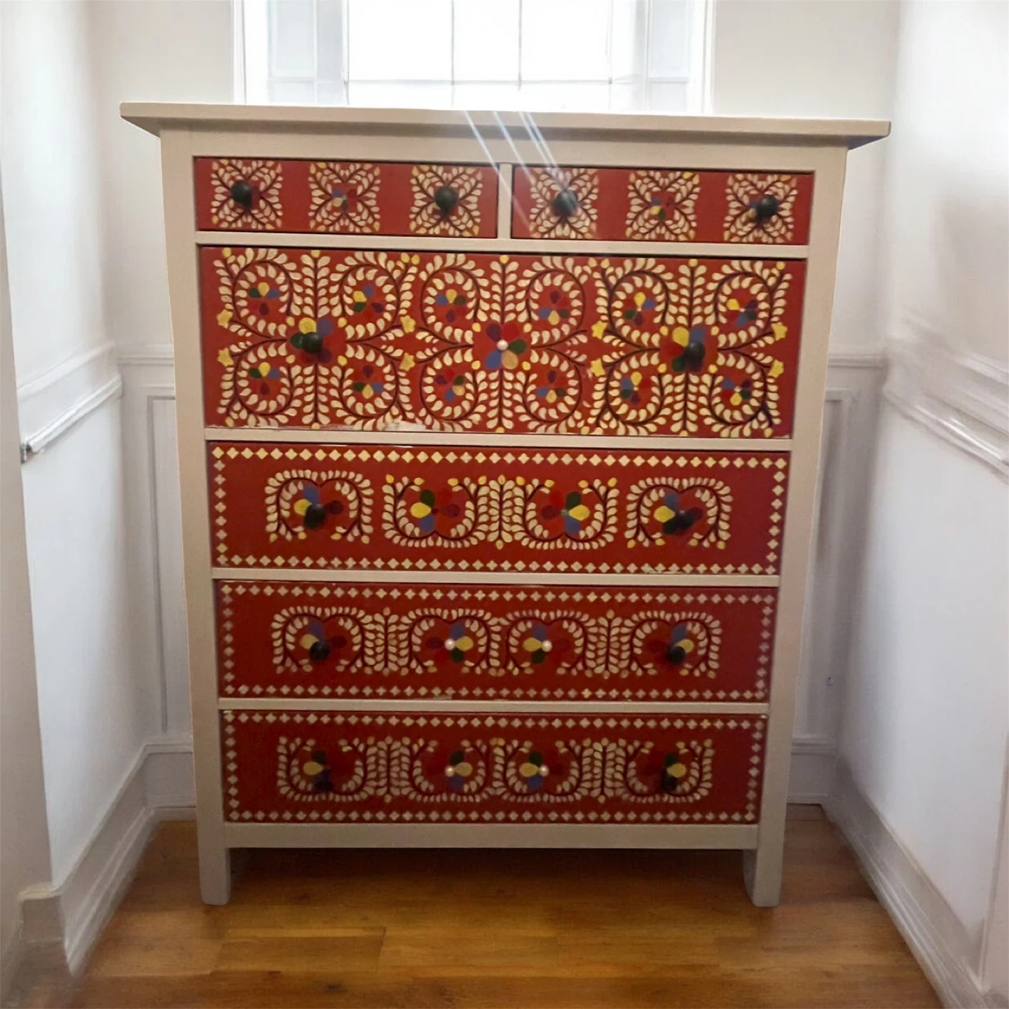 Here's a unique chest of drawers with a beautiful painted design! It features multiple drawers for ample storage. The colors are vibrant and the overall condition is great. Perfect for adding a touch of character to any room