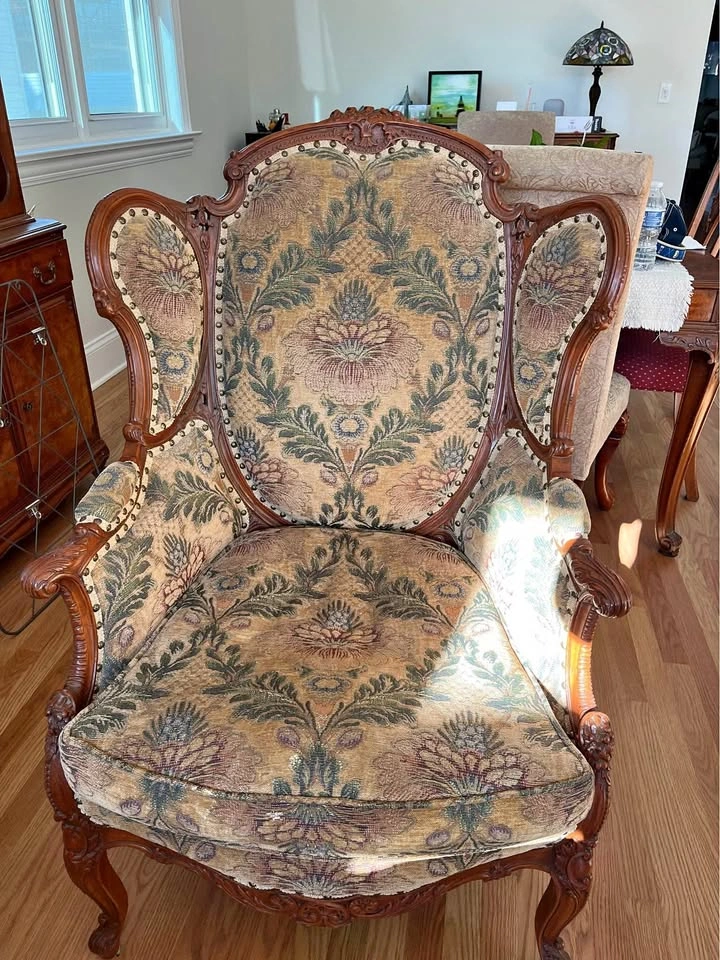 Reupholstered antique French Provincial arm chair. I have two. They were reupholstered five years ago and are in great condition. I will sell separately or as a set. This one is 44.5 inches tall by 29 inches wide by 23 inches deep.