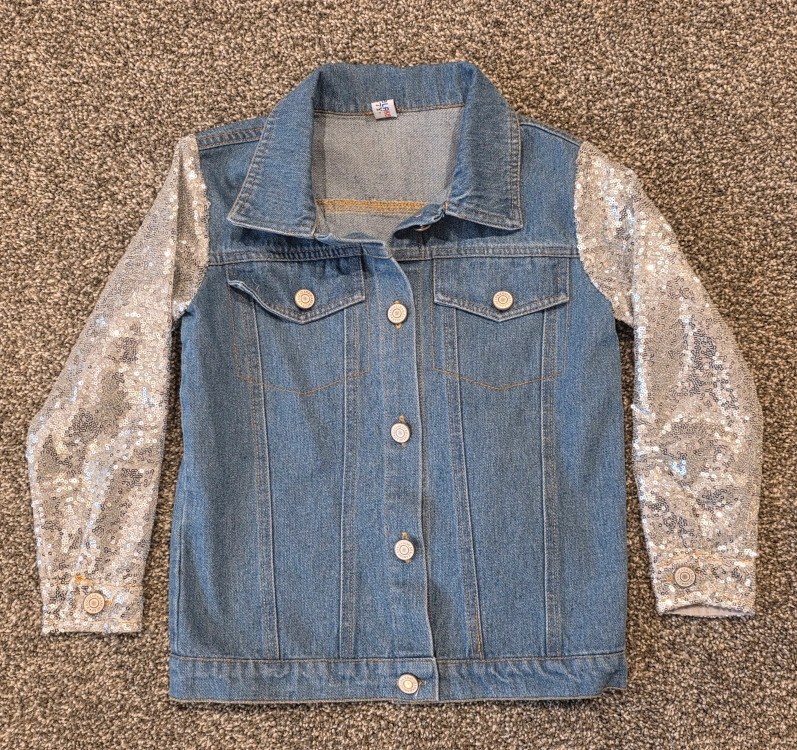 This adorable denim jacket features sequin sleeves and a cute unicorn applique on the back. It's perfect for adding a touch of sparkle to any outfit! Pick up in Naperville near naper blvd and 87th street or near downtown Naperville off of Chicago and Charles