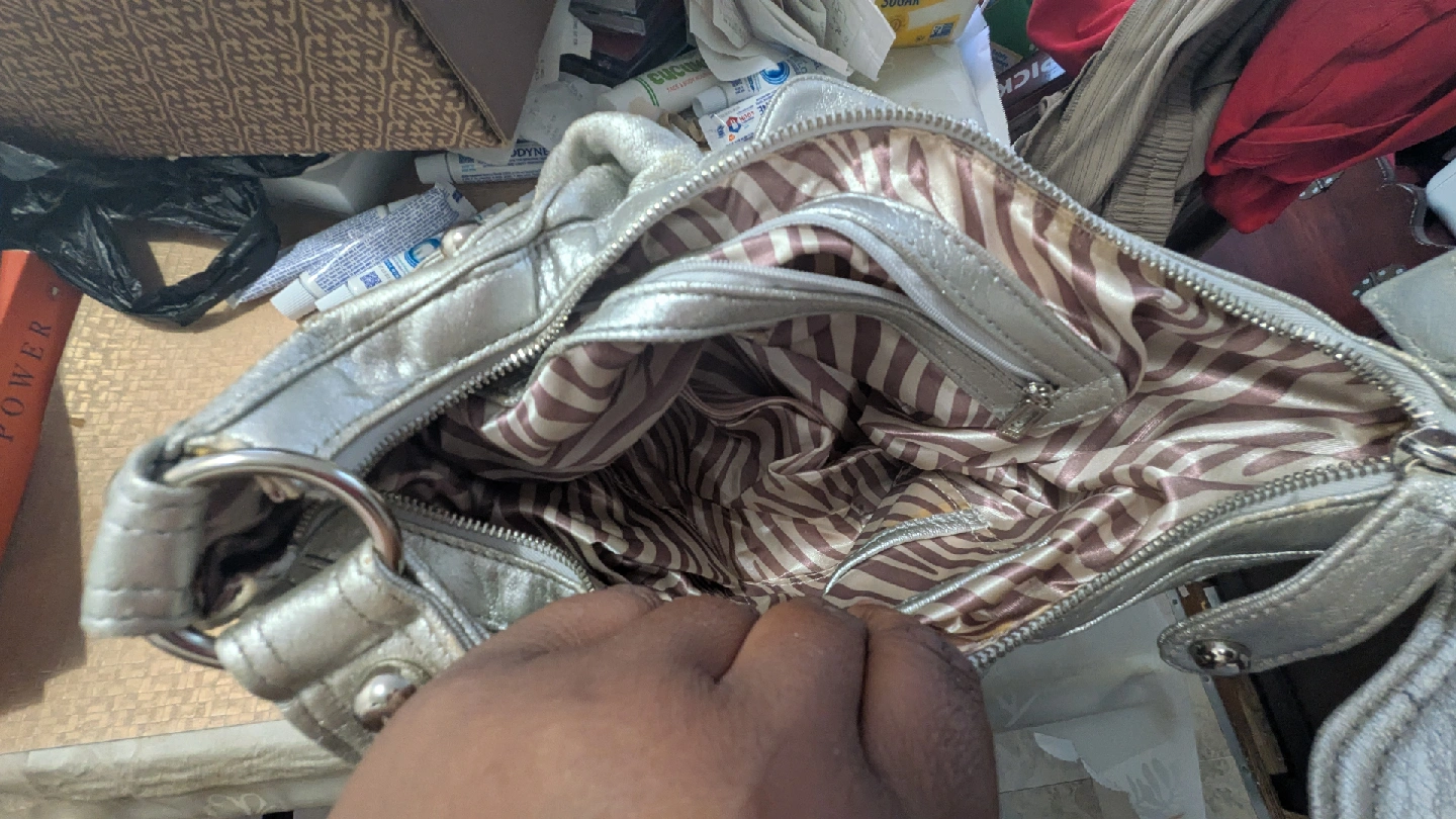 Here's a Guess silver purse. It has a striped interior lining. Only used once or twice. Has a rip on the front that needs to be sewn. Otherwise in like new condition. Rated good due to the rip!