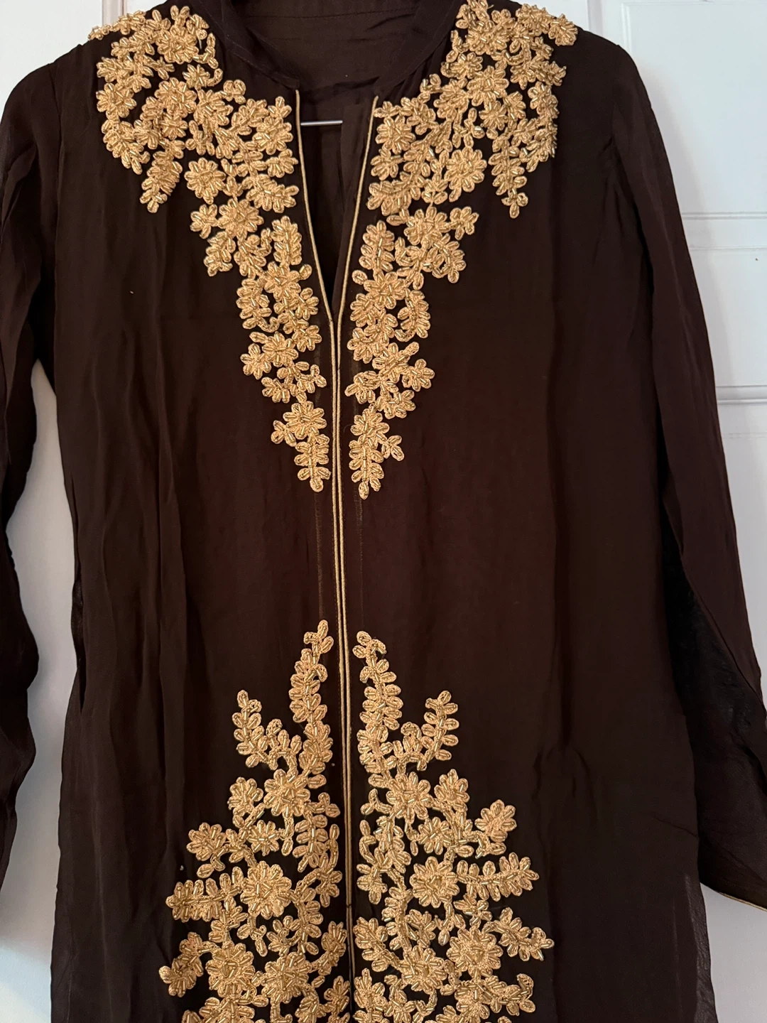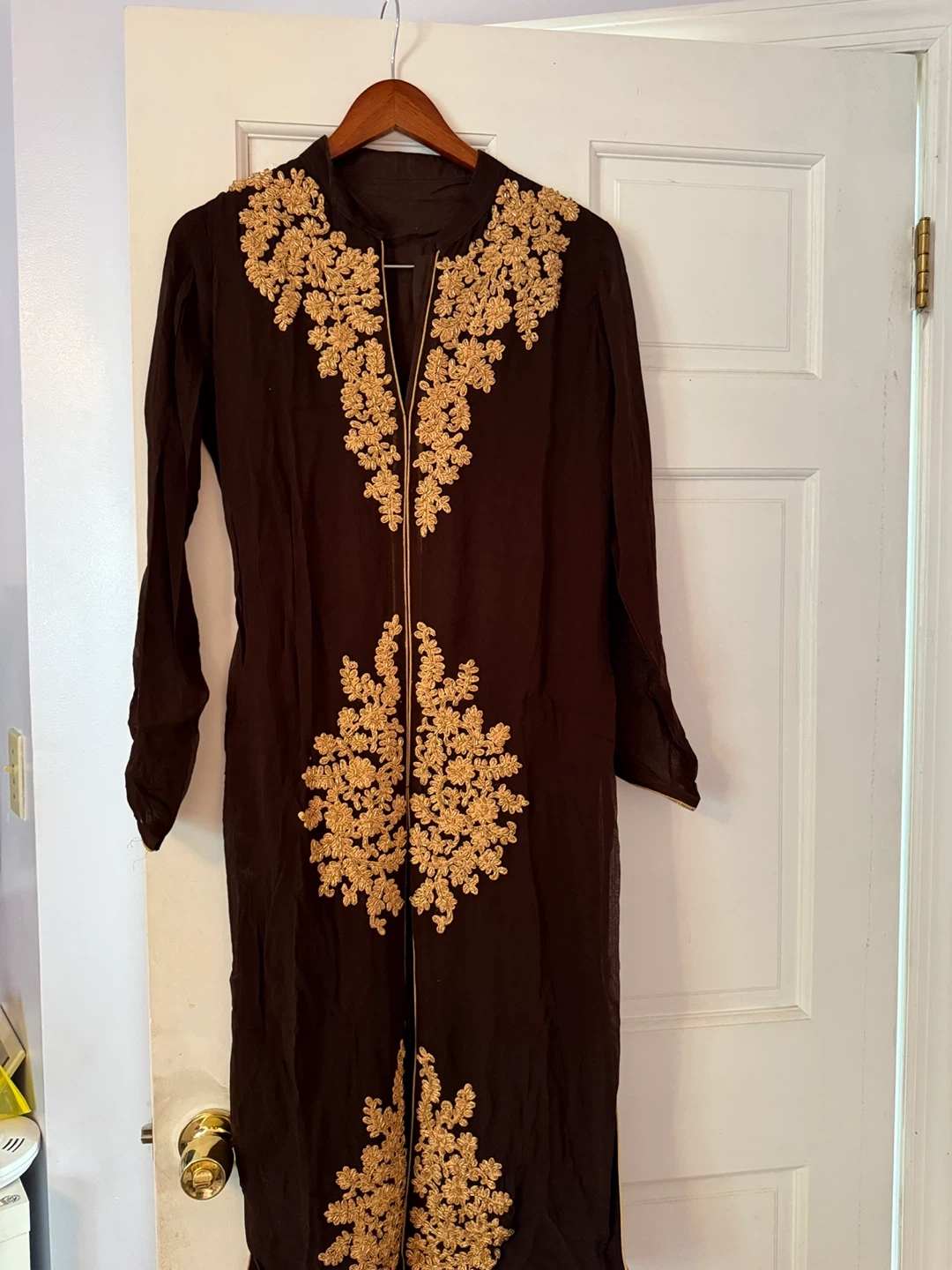 211Selling a brown long-sleeved dress with beautiful gold embroidery. It's in great condition and ready for a new home!