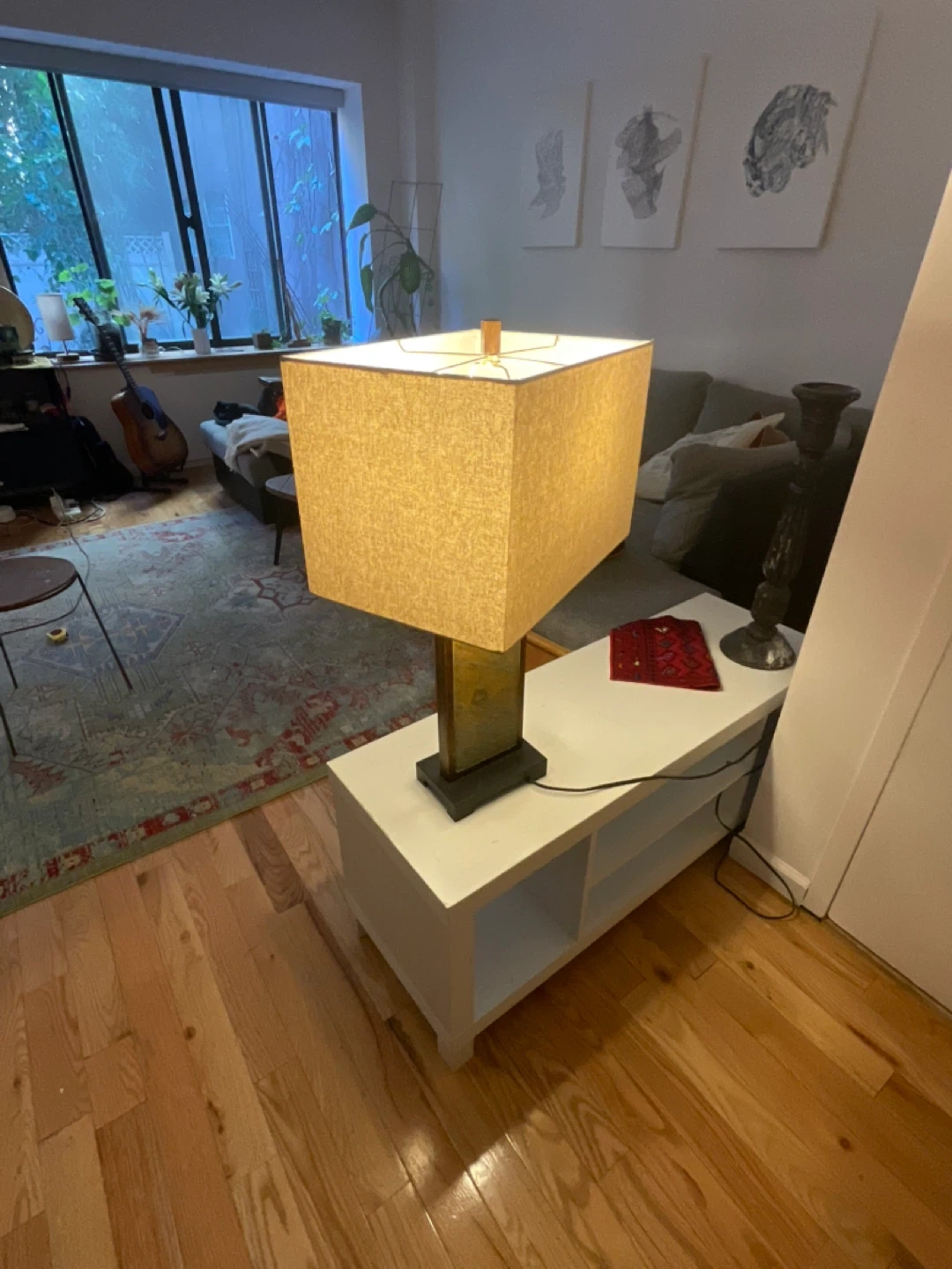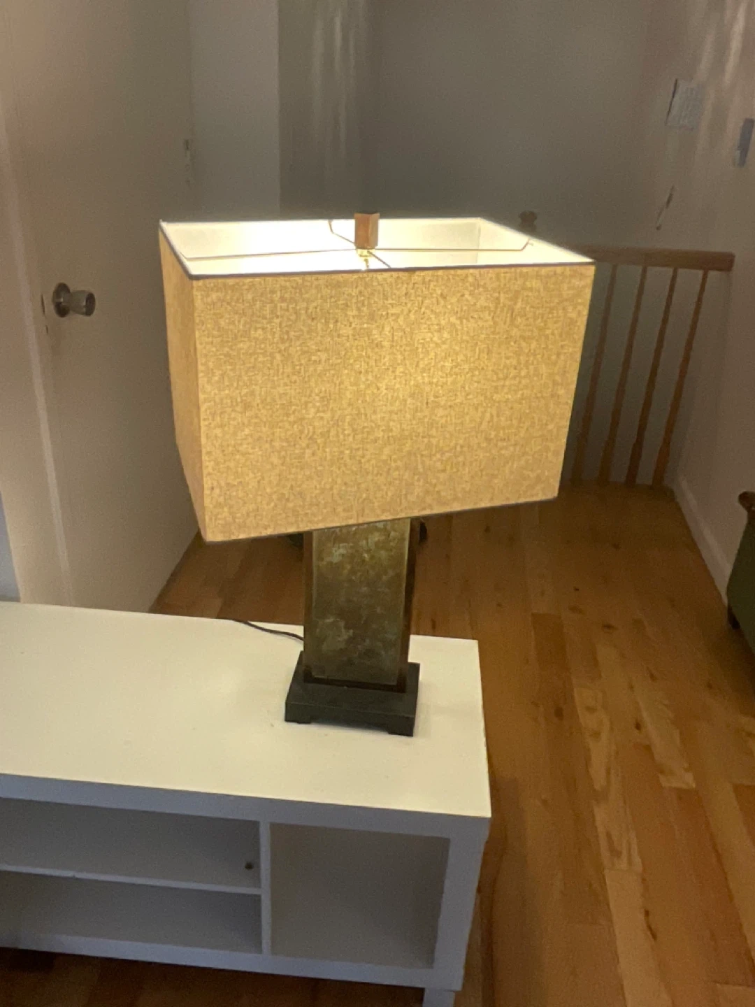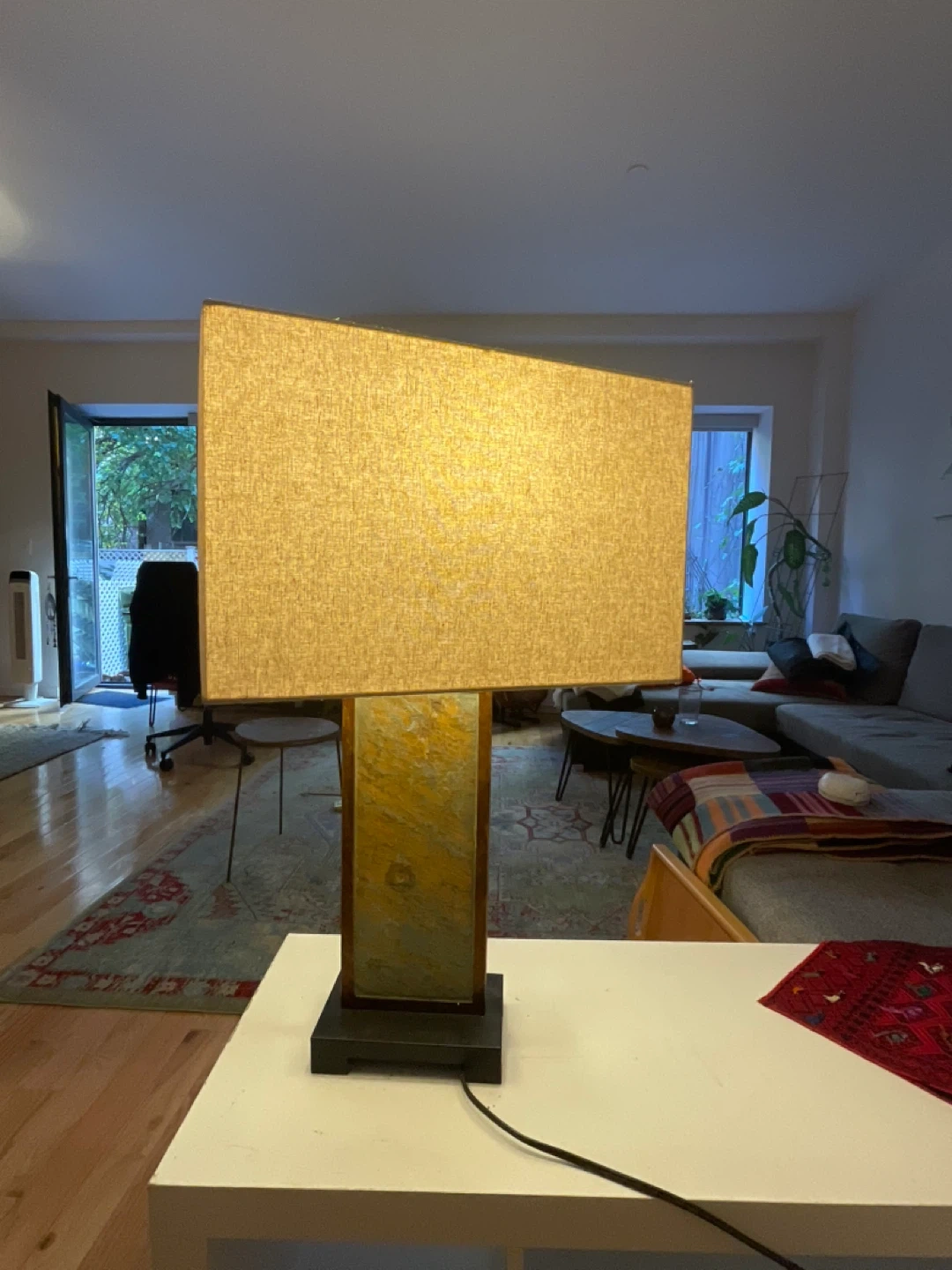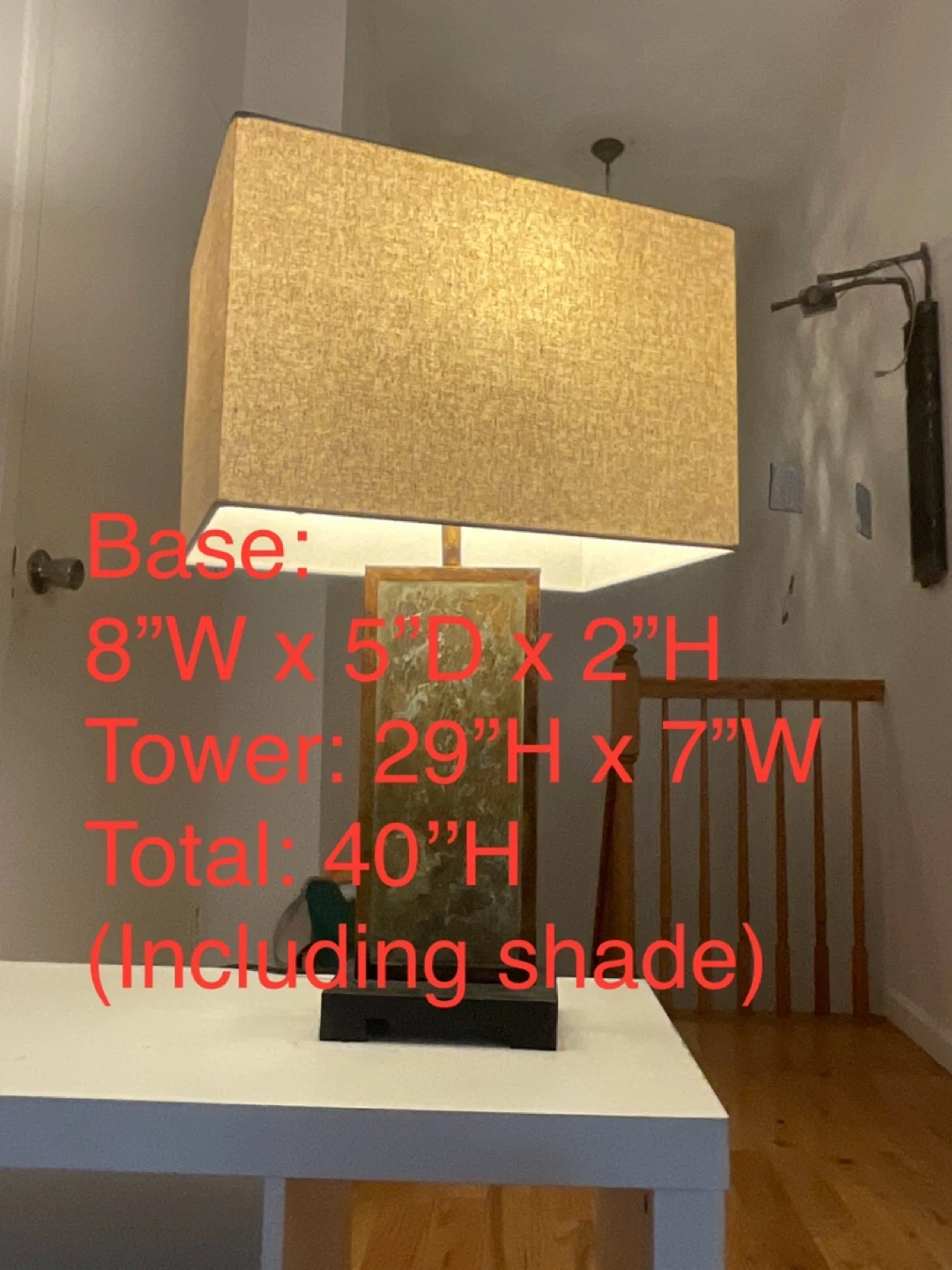 Selling a unique table lamp! It's 40 inches tall, including the shade. The base is 8" wide x 5" deep x 2" high, and the tower is 29" high x 7" wide. It would look great in any room!