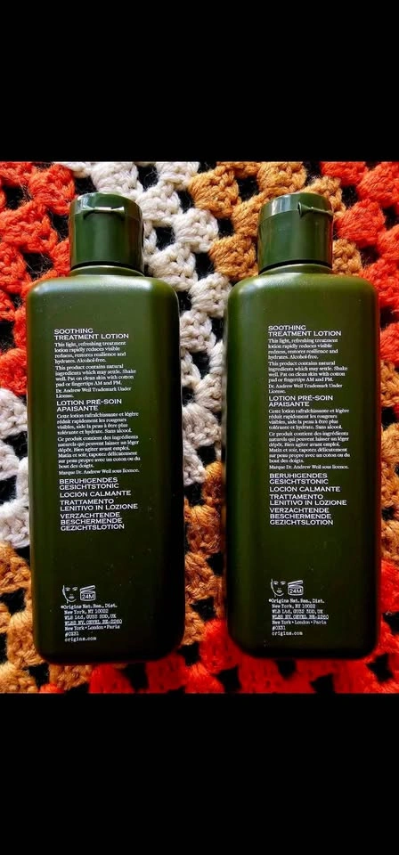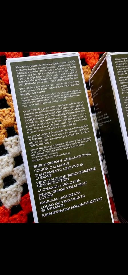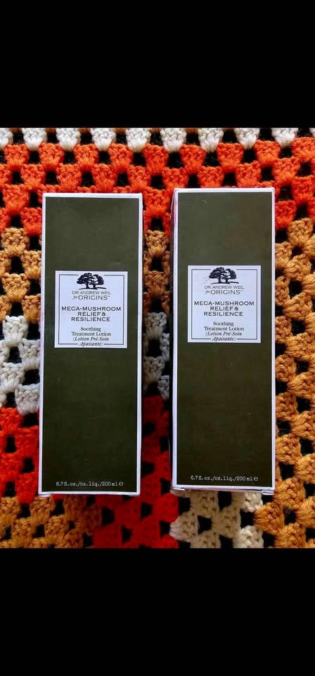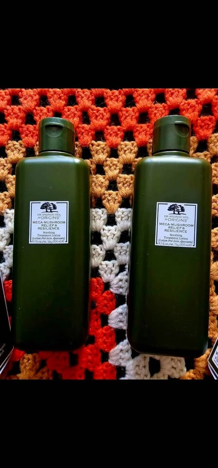 Two full-size, new and unopened bottles of Dr. Andrew Weil Origins Mega-Mushroom Relief and Resilience Soothing Treatment Lotion, 200ml per bottle. Vegan and cruelty-free skincare with reishi mushroom, fermented chaga mushroom, licorice root, and hyaluronic acid as active ingredients. Retail value is $62 per bottle.