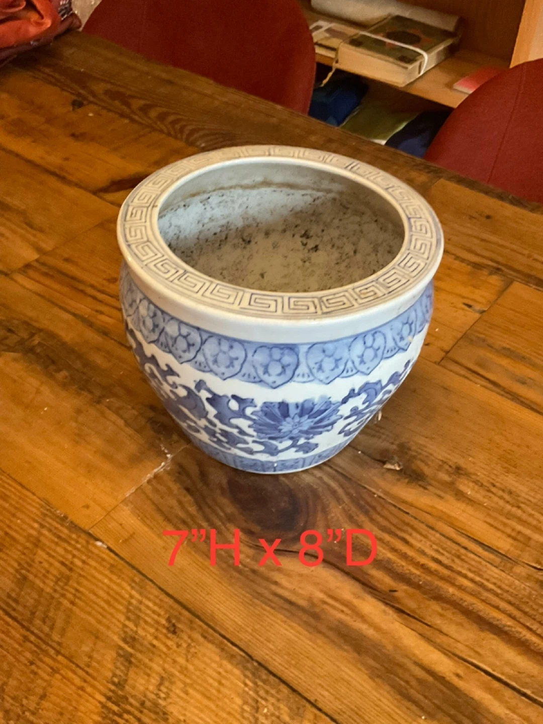 Lovely blue and white ceramic planter with a floral design! It measures approximately 7 inches in height and 8 inches in diameter. Perfect for adding a touch of elegance to your indoor or outdoor space
