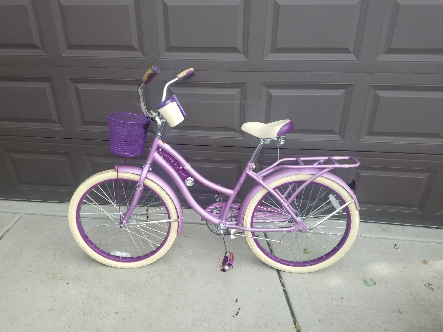 Selling a purple Huffy Perfect Frame cruiser bike! It's a stylish and comfortable ride for leisurely outings. Features a basket in the front and a rack in the back! Great for running errands or just enjoying a ride around the neighborhood Huffy 24" Nel Lusso Cruiser Bike, Fits Riders 4'8" - 5'8", Purple, Adult, Women's