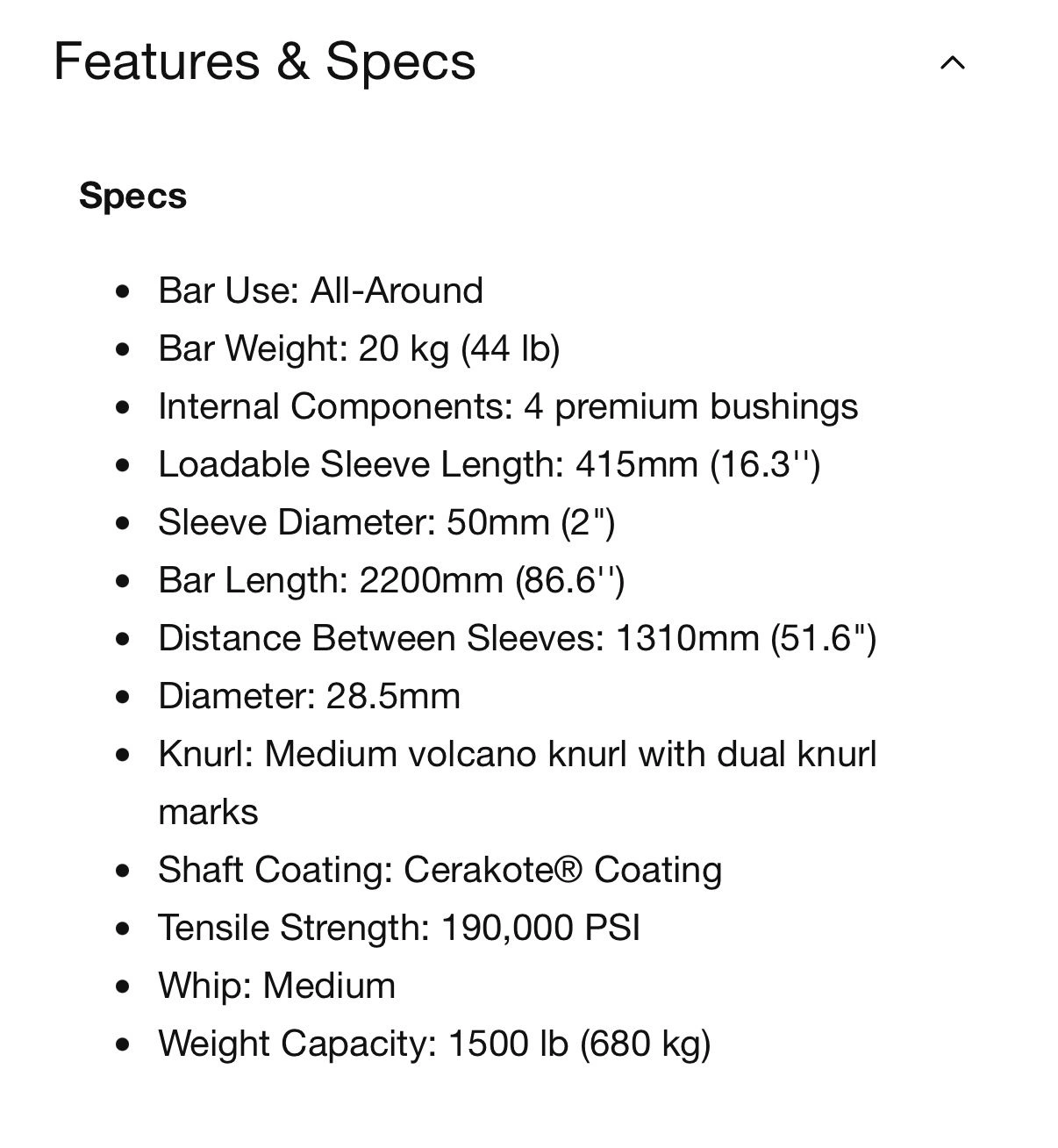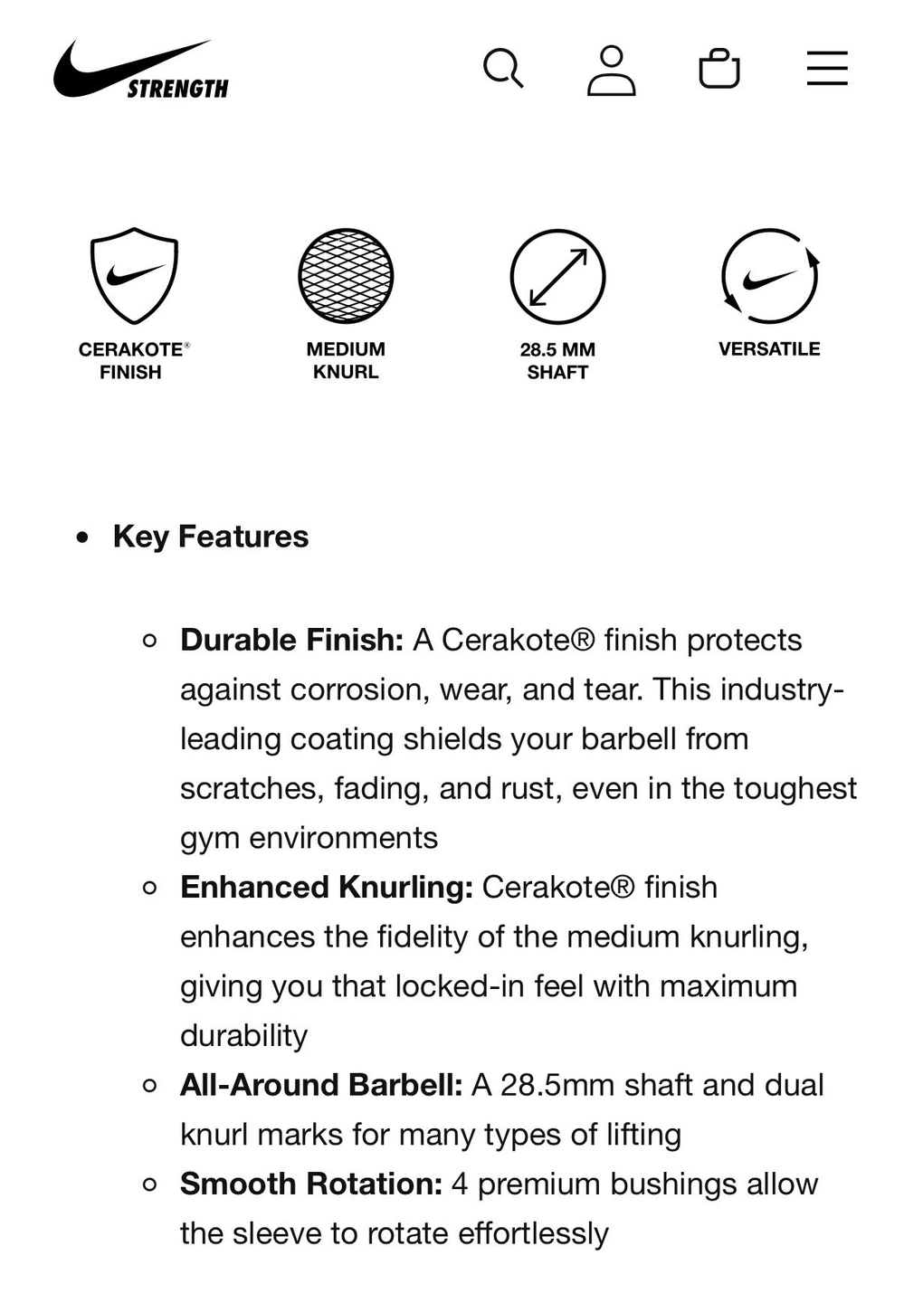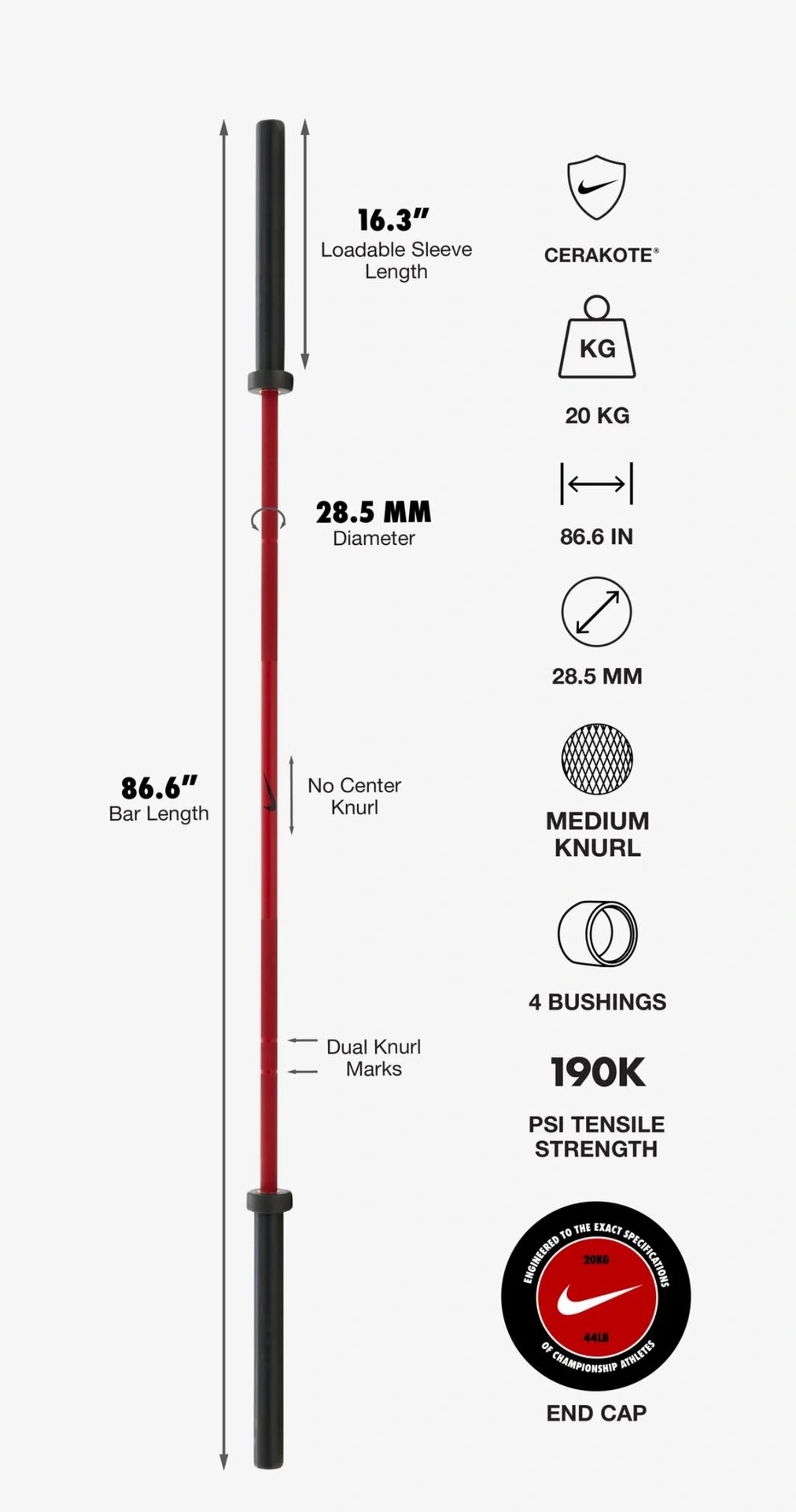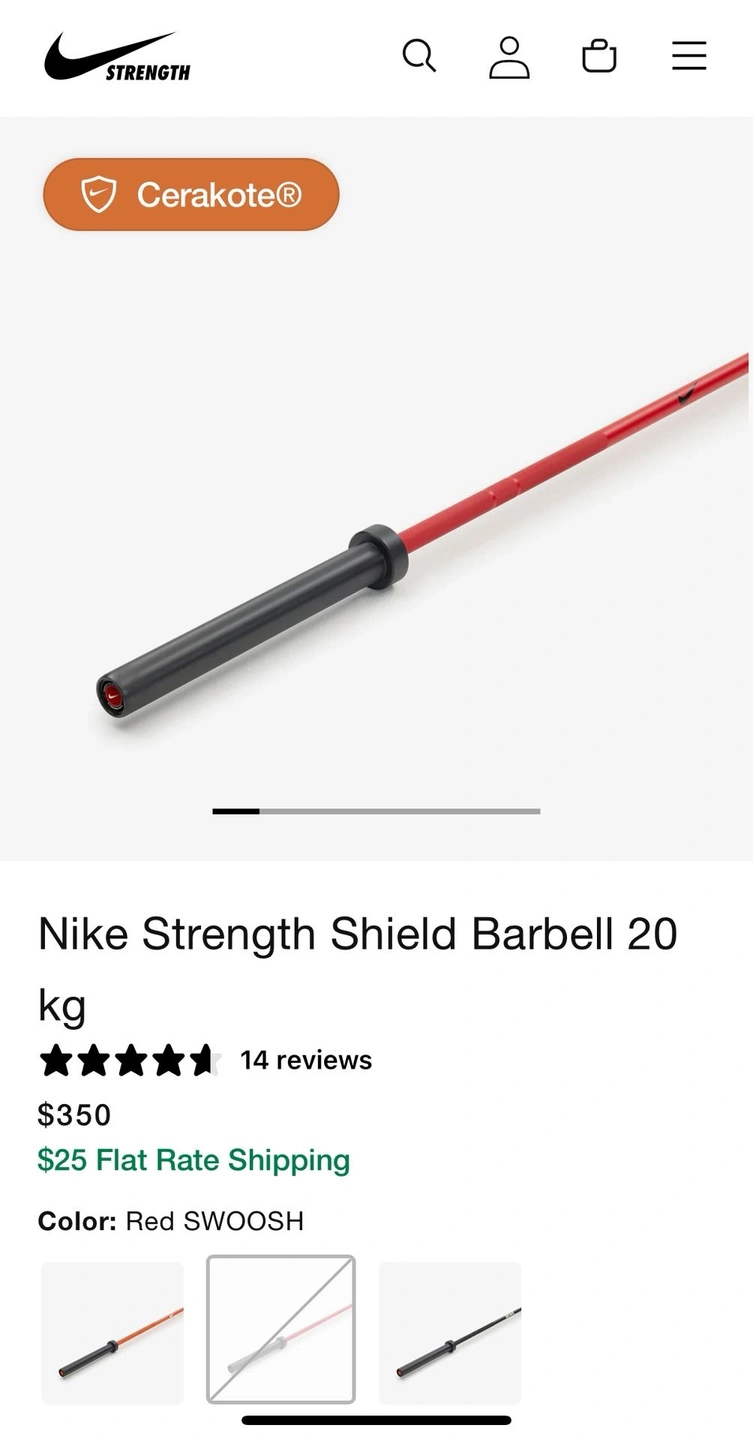 15Nike Strength Olympic Barbell in phenomenal condition. Very comparable to a Rogue Ohio Bar. Competes very well. Red Cerakote Finish that is always SOLD OUT. The sleeves spin like a dream. This is an excellent Olympic barbell Can be used for Olympic lifting and CrossFit. Weight Per Unit: 31-50.5lbs Type: Olympic Brand: Nike