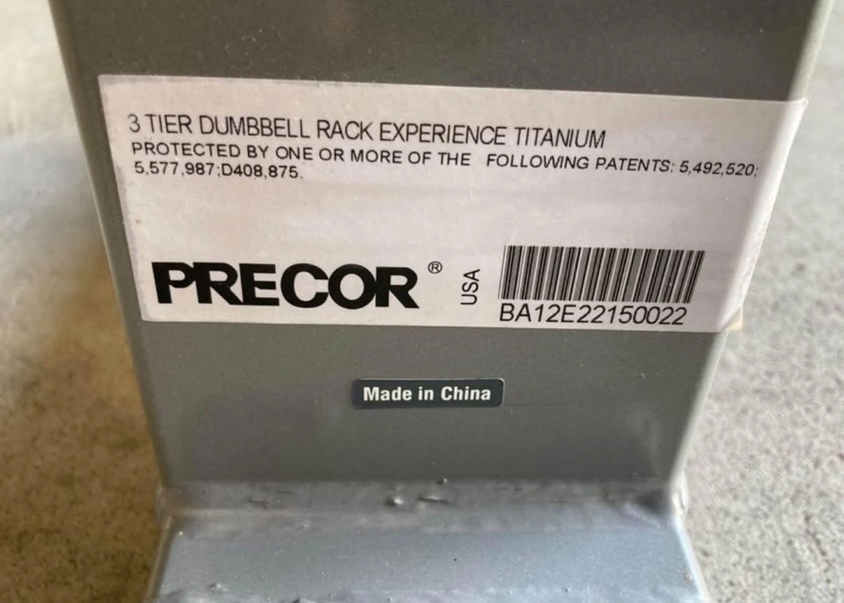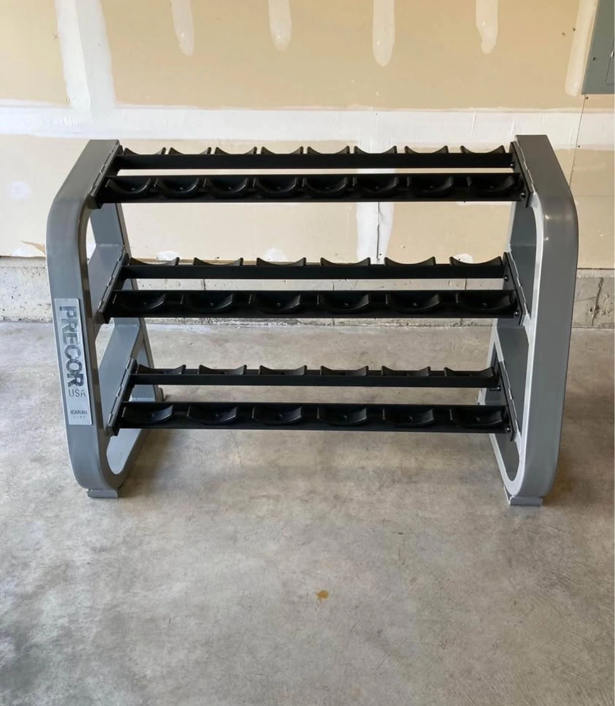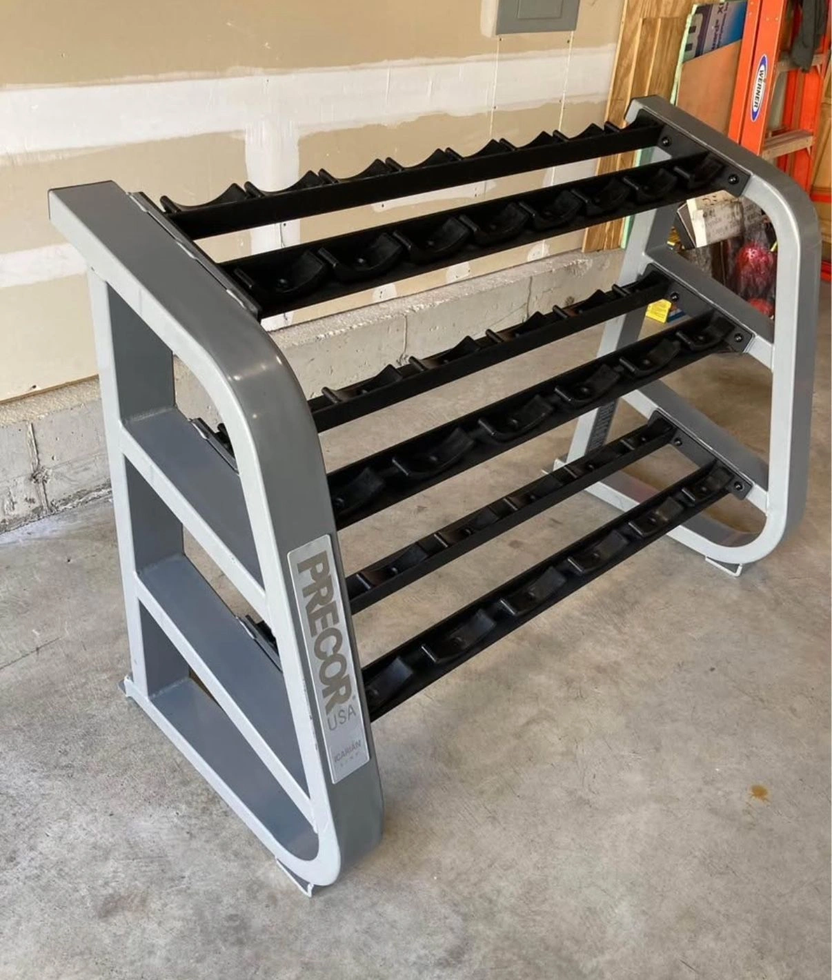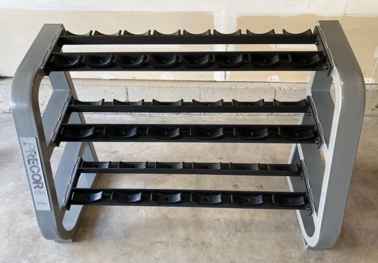 15Precor 3 Tier Dumbbell Rack Experience Titanium. Icarian Line. Saddles are all pristine and tight. Can Handle all styles and types of Dumbbells. 57” wide 29” deep 40” high WILL BE DISASSEMBLED AT TIME OF PICK UP FOR EASY TRANSFER AND TRANSPORT. This rack is HEAVY!