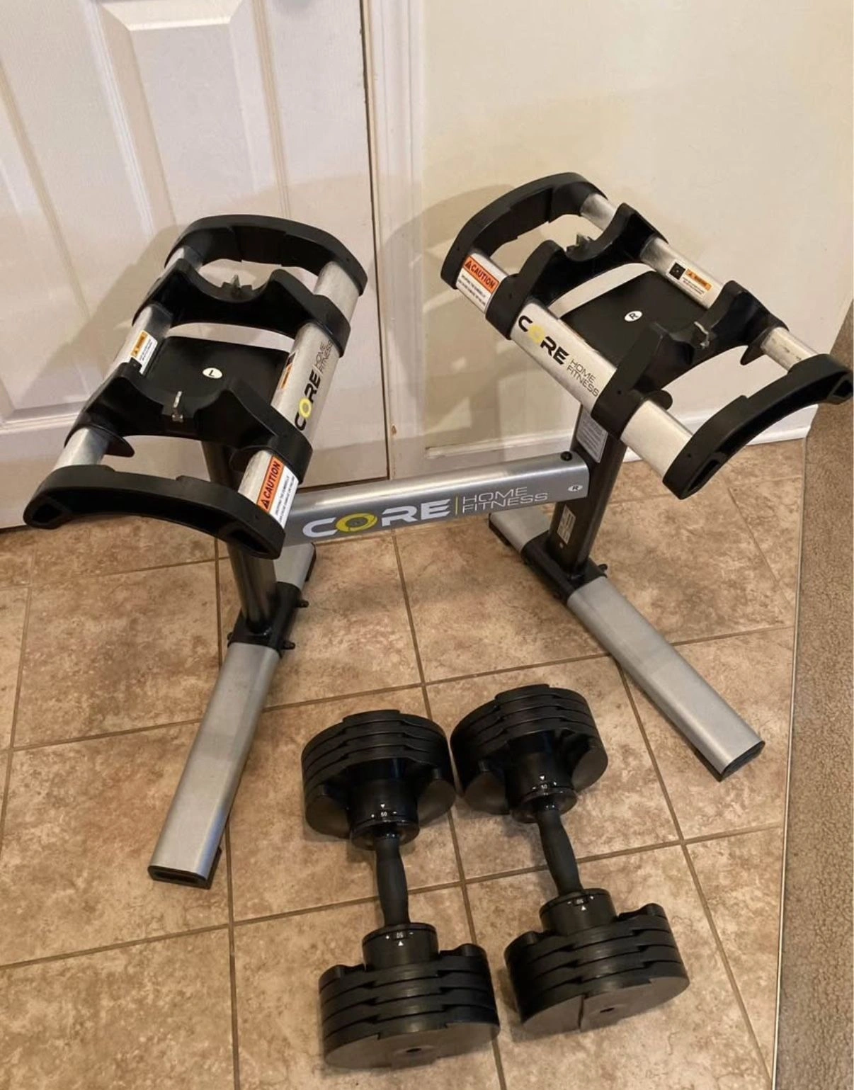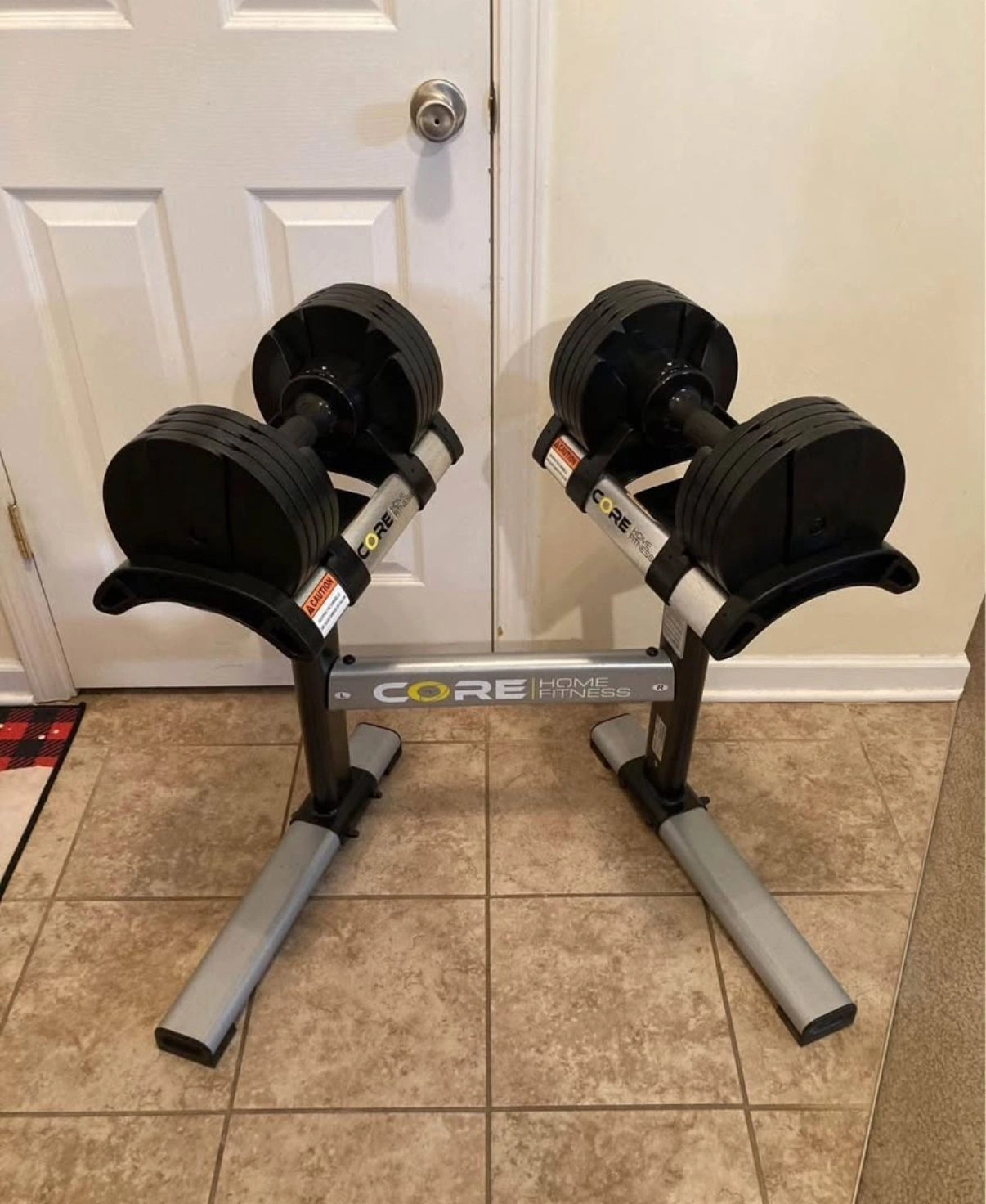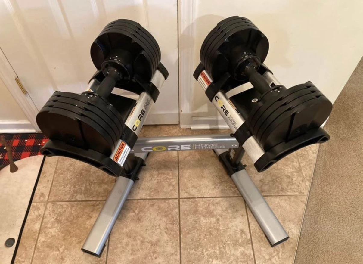 15Core Home Fitness Adjustable Dumbbells in phenomenal condition. They go from 5 pounds to 50 pounds in 5 pound increments. Comes with the stand. Very cool style and design and feel. Almost like using a regular set of pro style gym dumbbells, not bulky at all. One of the top rated adjustable dumbbells on the market. They sell out a lot.