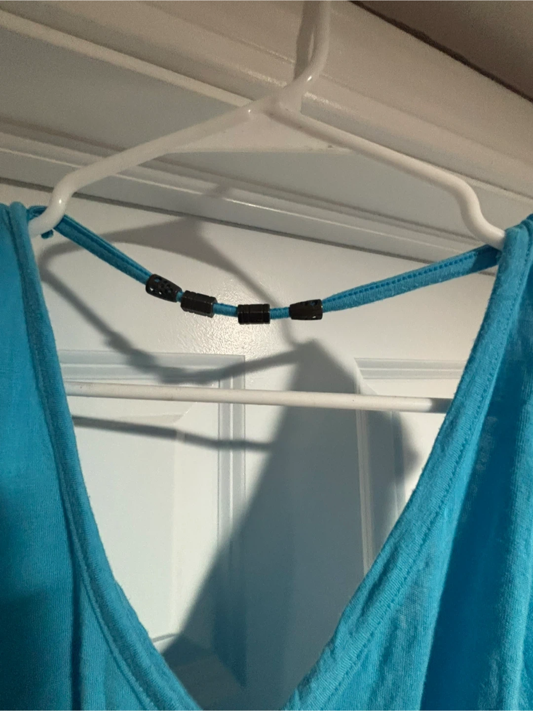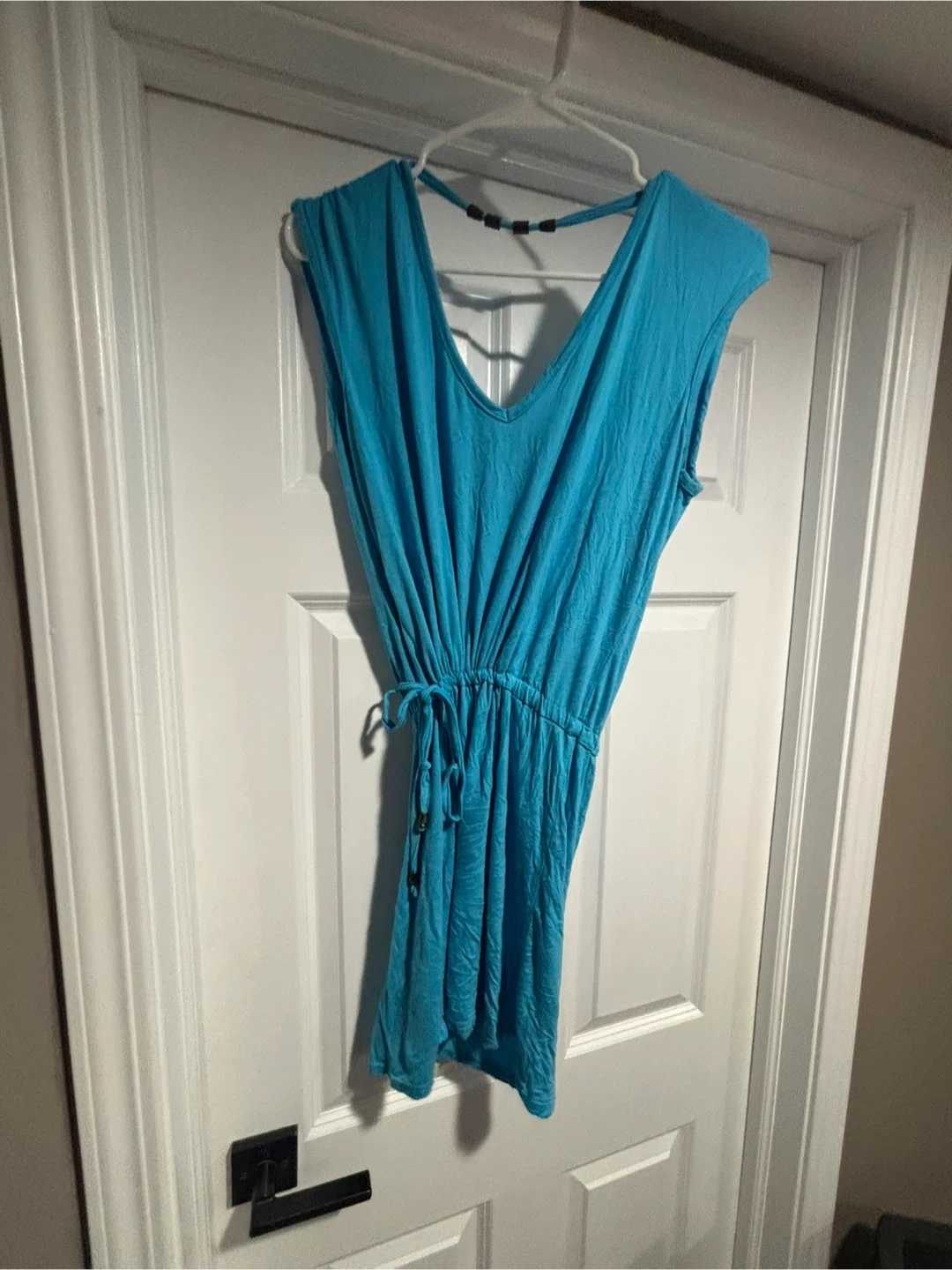 20This is a cute blue dress! It features a V-neck, with necklace and a tie at the waist. It's in great condition and ready for a new home