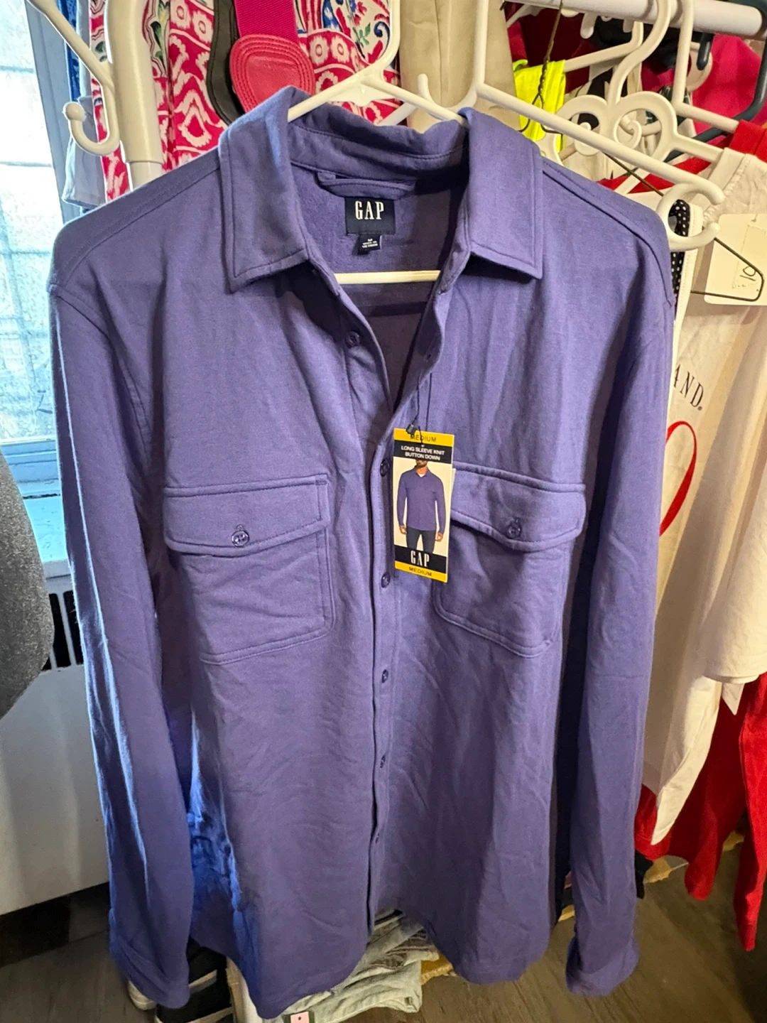 153Here's a GAP long sleeve knit button-down shirt in size medium! It's a stylish and comfortable piece, perfect for casual wear. The shirt features a classic button-down design with a soft knit material. It's in great condition and ready for a new home