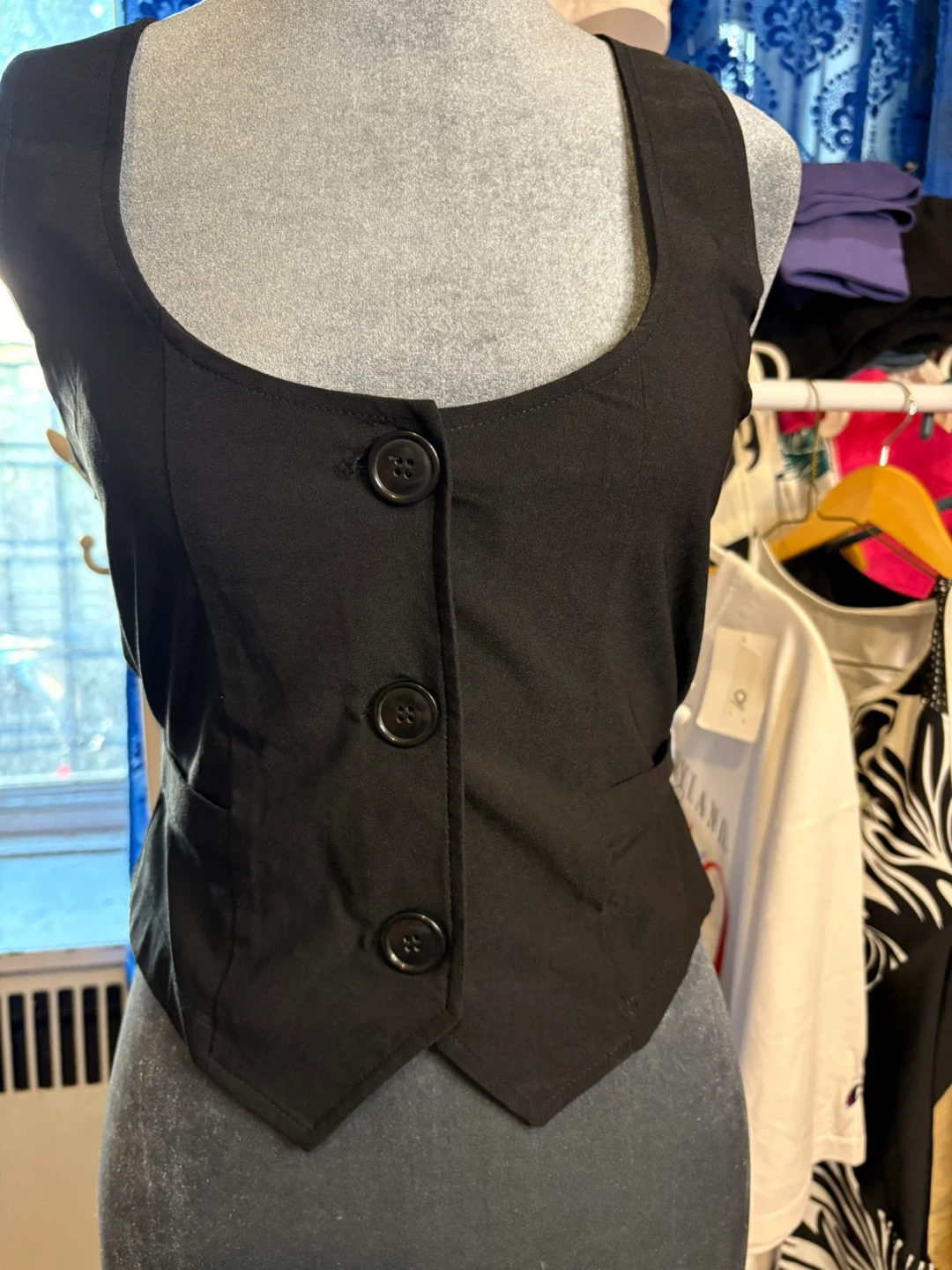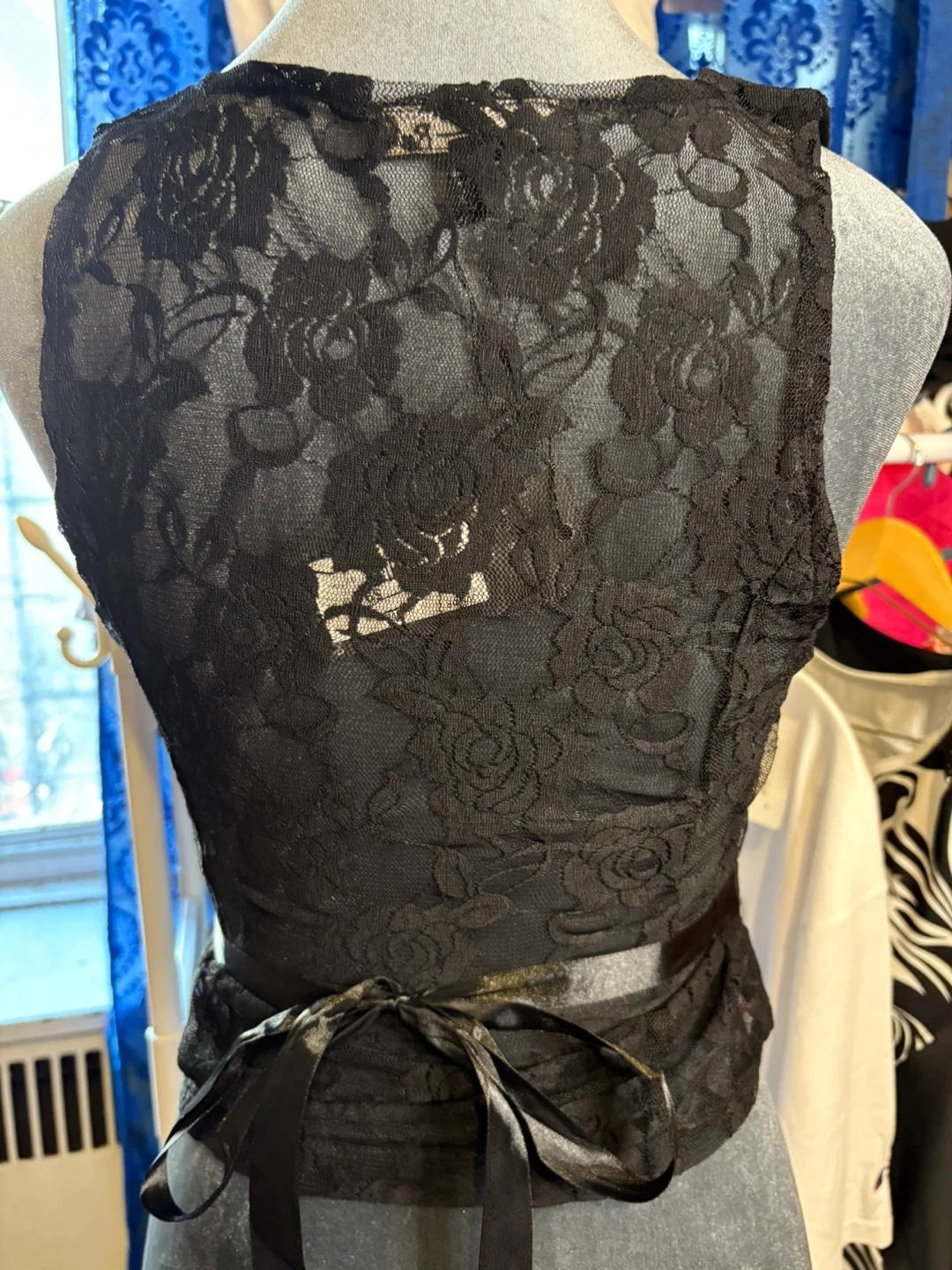 I am selling a black lace vest. It features a tie at the waist and button-up front. It's in great condition!