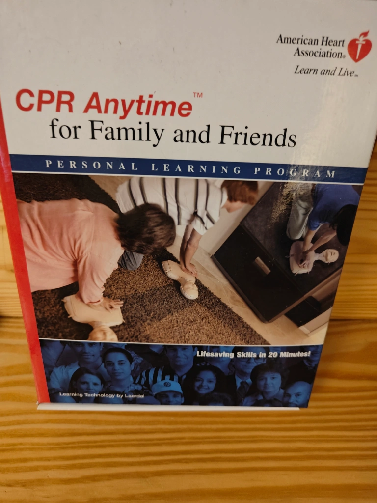 Offering a CPR Anytime for Family and Friends Personal Learning Program kit. It includes the necessary materials for learning lifesaving skills in 20 minutes. Kit only for personal use or use with family and friends (Used) inflatable dummy with hard face and chest click sound