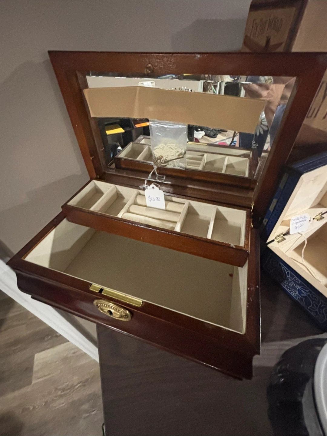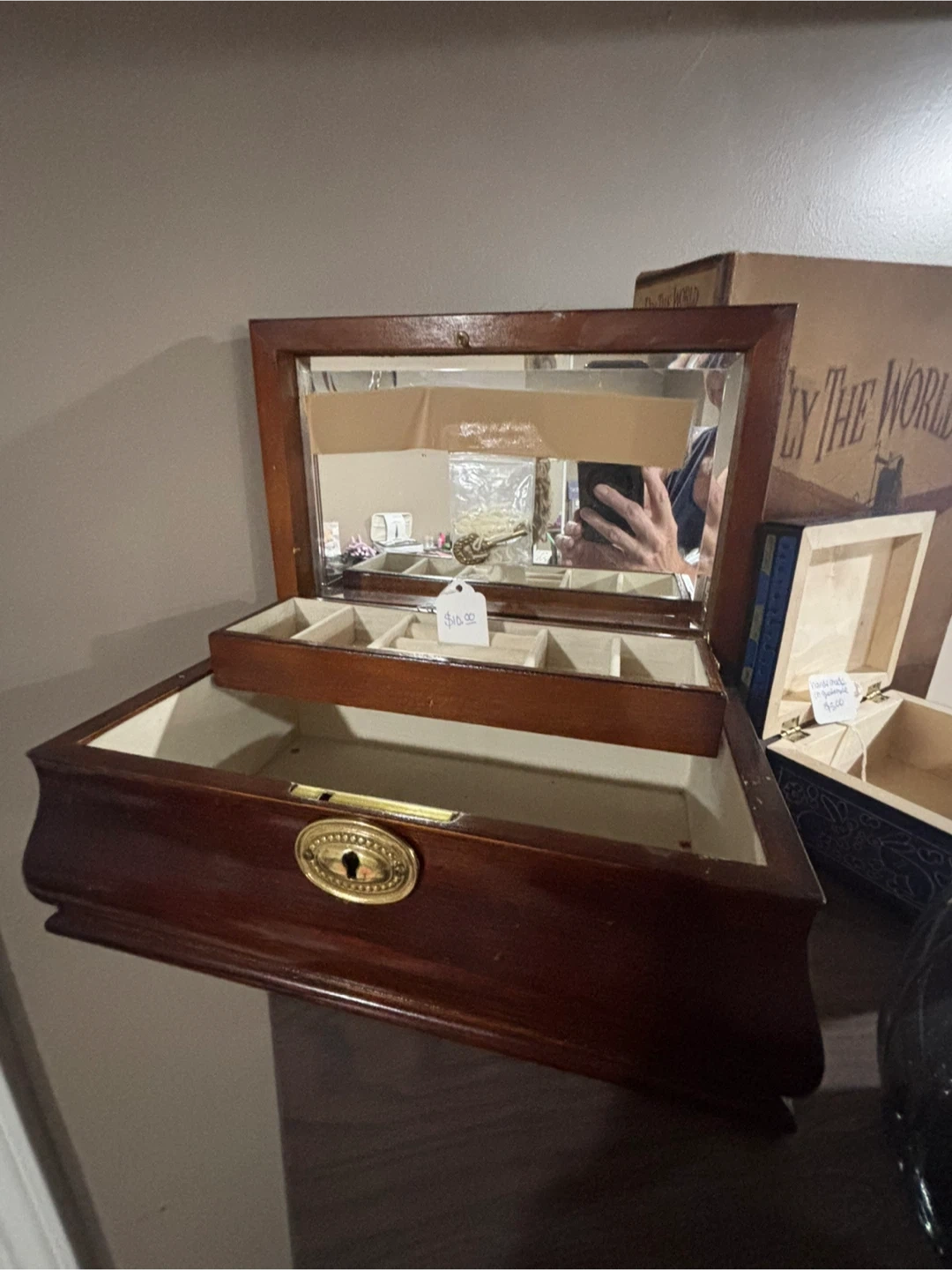 20Here's a lovely wooden jewelry box with a mirror. It has several compartments for organizing your jewelry. It's in good condition and ready to be used!