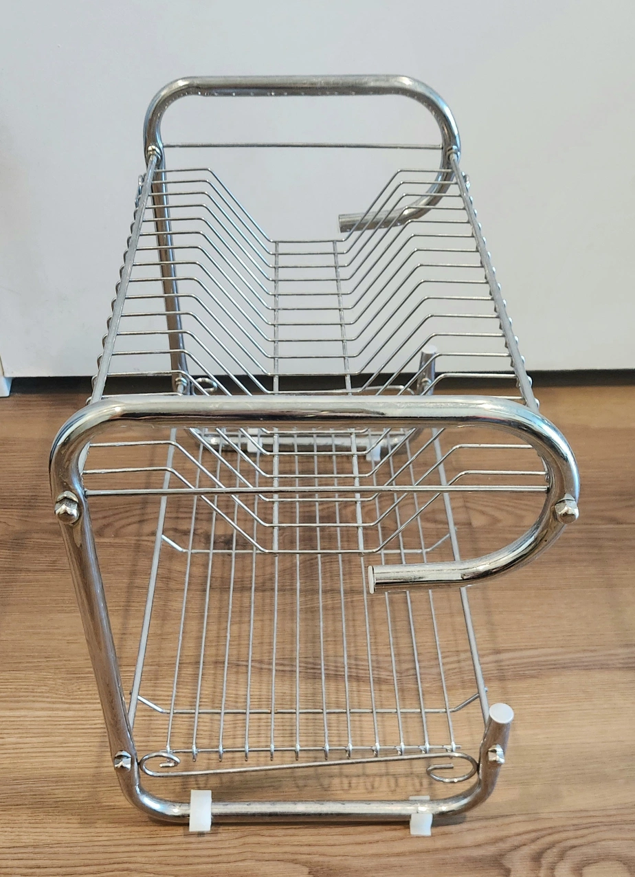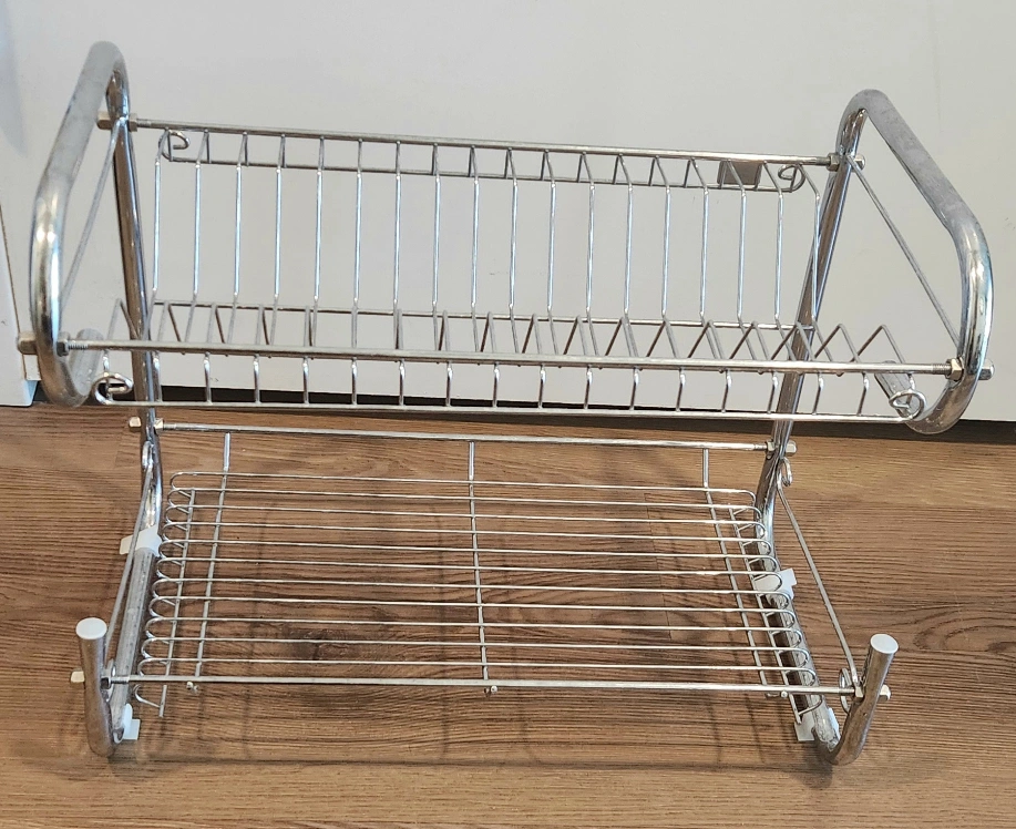 Here's a chrome dish drying rack! It's a great way to keep your dishes organized and dry after washing. It has two tiers for maximum storage and is in good condition