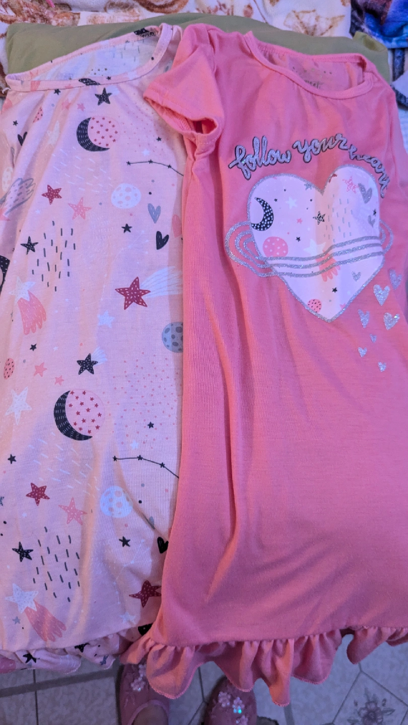 Two cute pajama dresses for girls! One is light pink with a moon and stars pattern, and the other is solid pink with a heart design. Both have short sleeves and a ruffled hem.