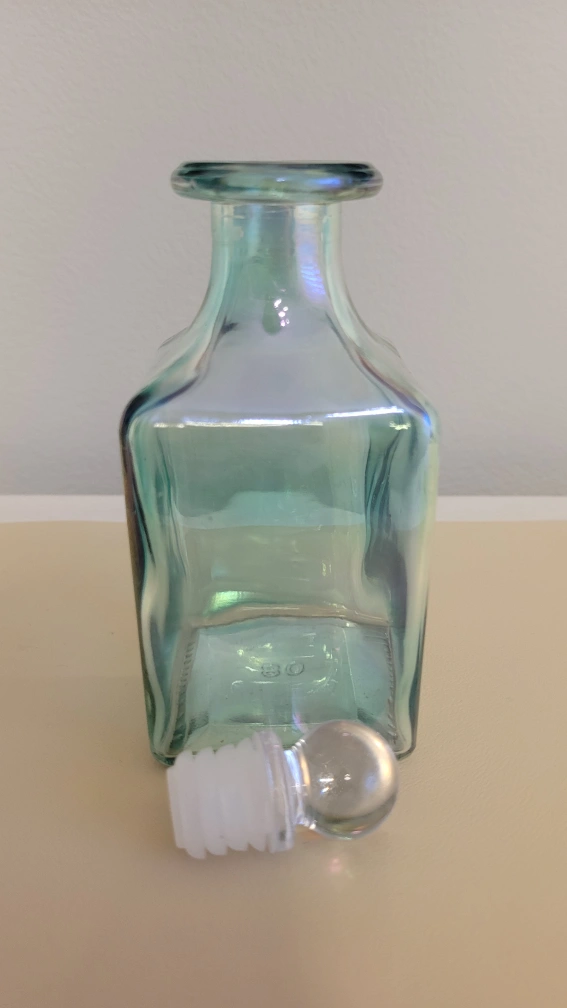 15Here's a cute decorative glass bottle with a stopper. It stands about 6 inches tall. Perfect for adding a touch of charm to any room!