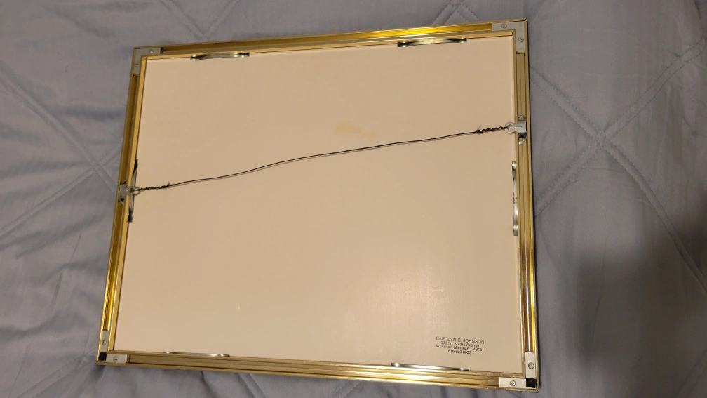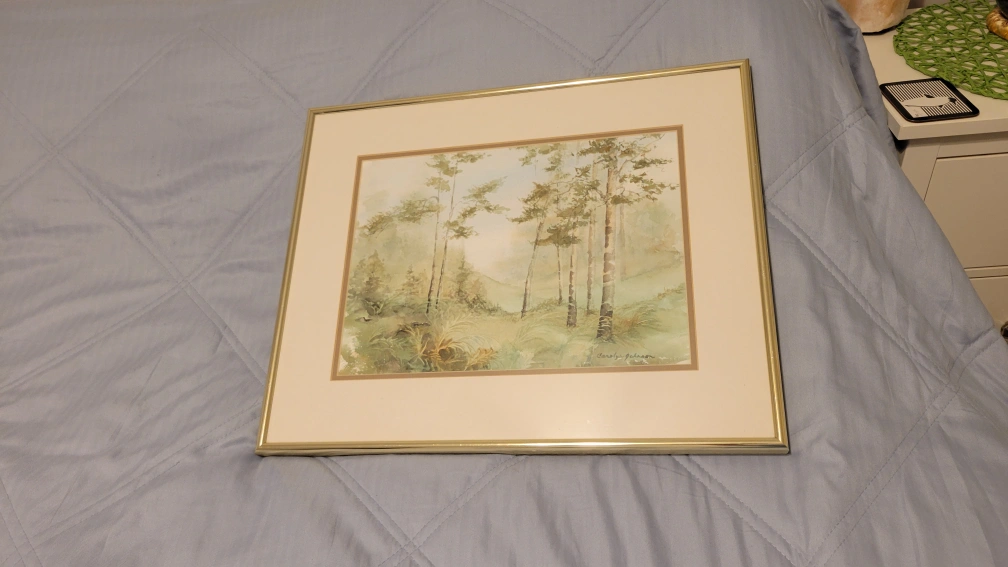 15Framed watercolor painting by Carolyn Johnson. The painting features a serene landscape of trees in soft, muted tones. The frame is gold-colored and adds a touch of elegance to the piece. The back includes the artist's name and address.