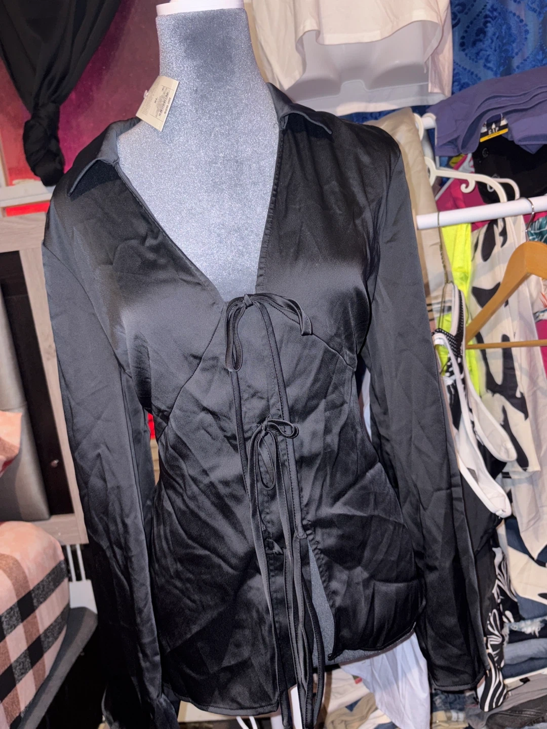 153Here's a cute black long sleeve blouse with a tie front detail! It's perfect for dressing up or down. The material is soft and comfortable, making it a great addition to any wardrobe