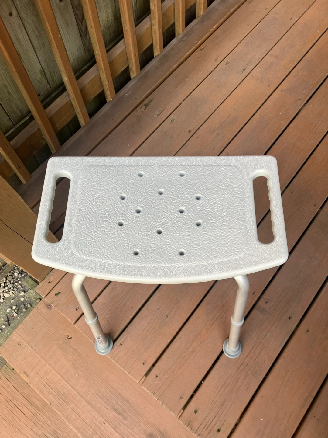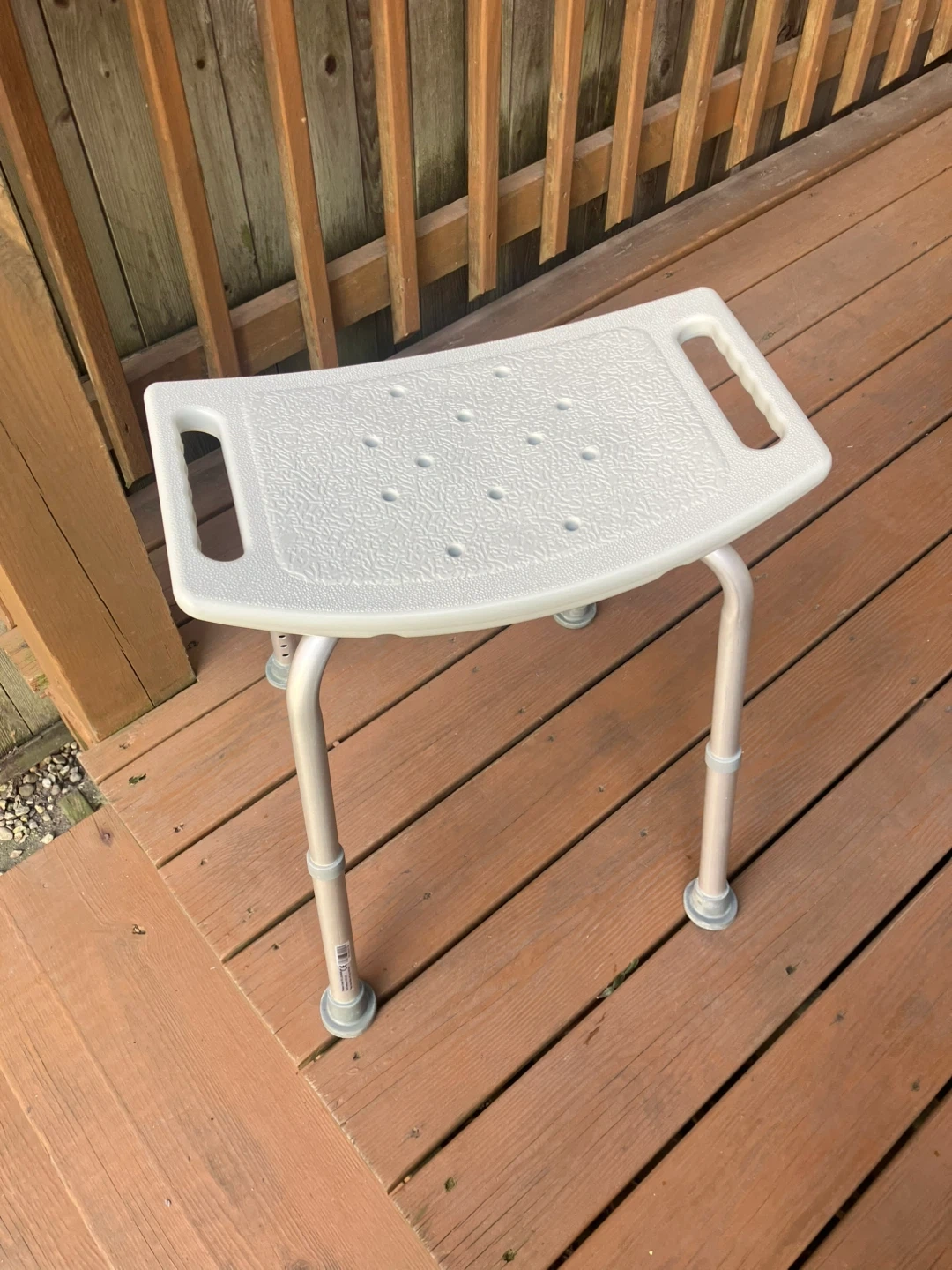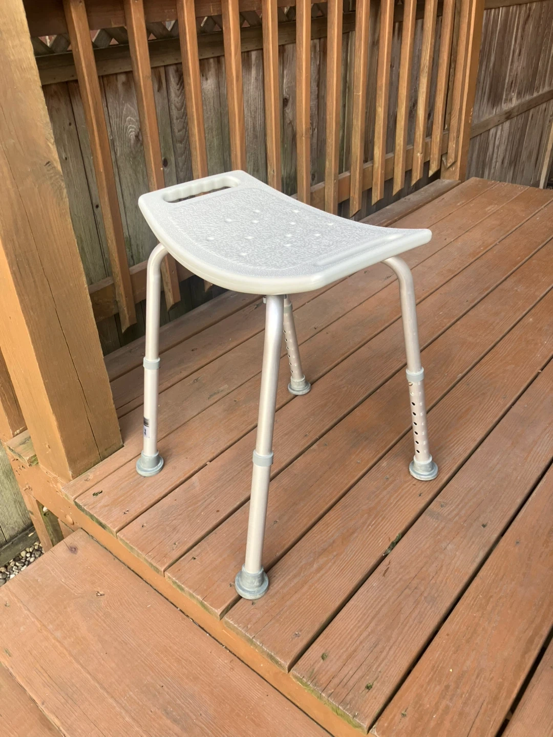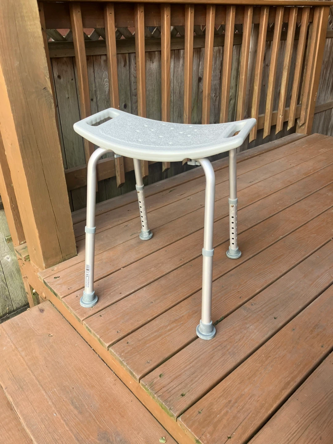 Deluxe Aluminum Shower Bench - Excellent Condition Bench and legs are in excellent condition. Rubber feet show some wear but function perfectly. Weight capacity 300 lbs. Drainage holes in bench reduce slipping. Aluminum fame is lightweight, durable and corrosion proof. Legs are height adjustable in 1" increments, and angled with suction-style tips to provide additional stability. Made using recycled materials. From a smoke and pet free home. Check out in person before purchasing. Thanks for looking.