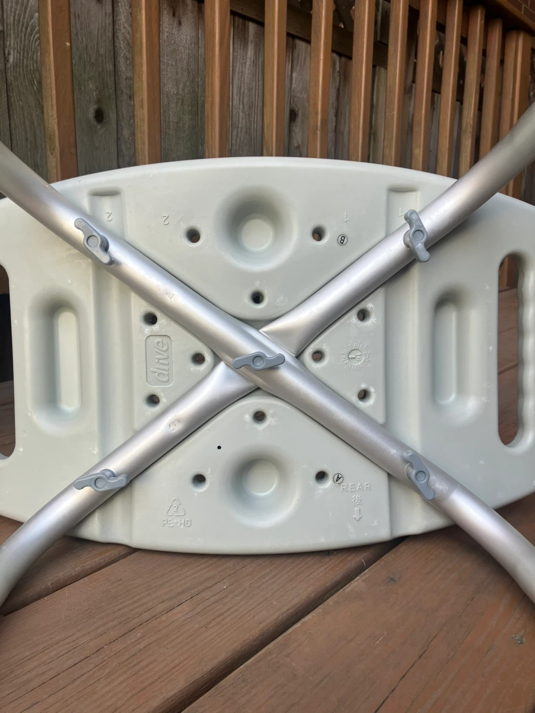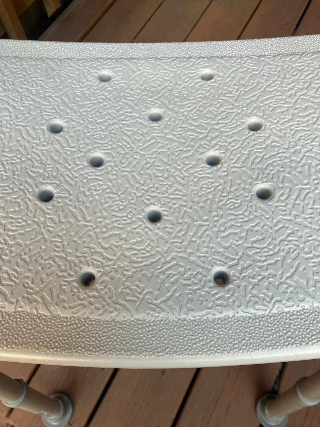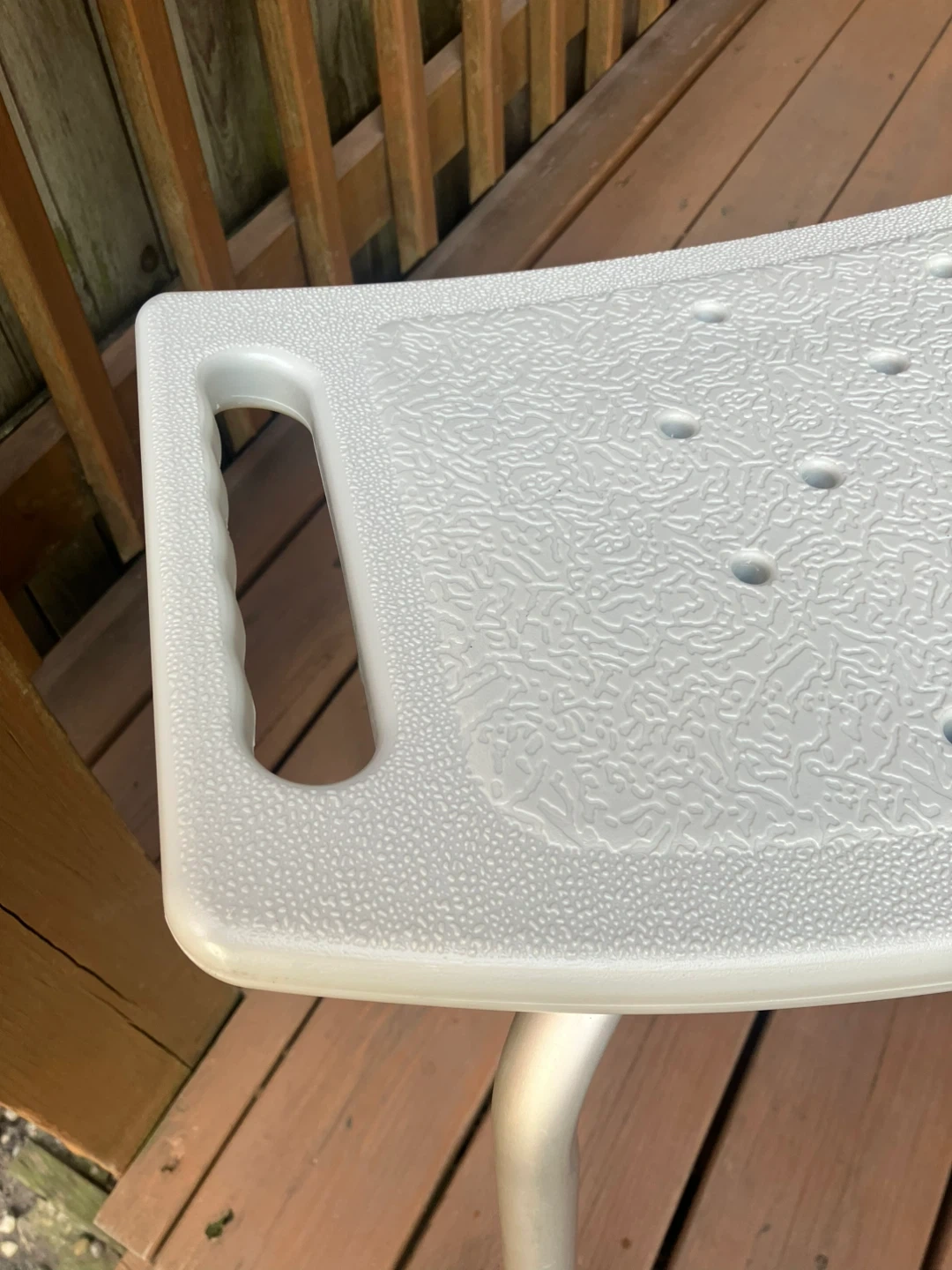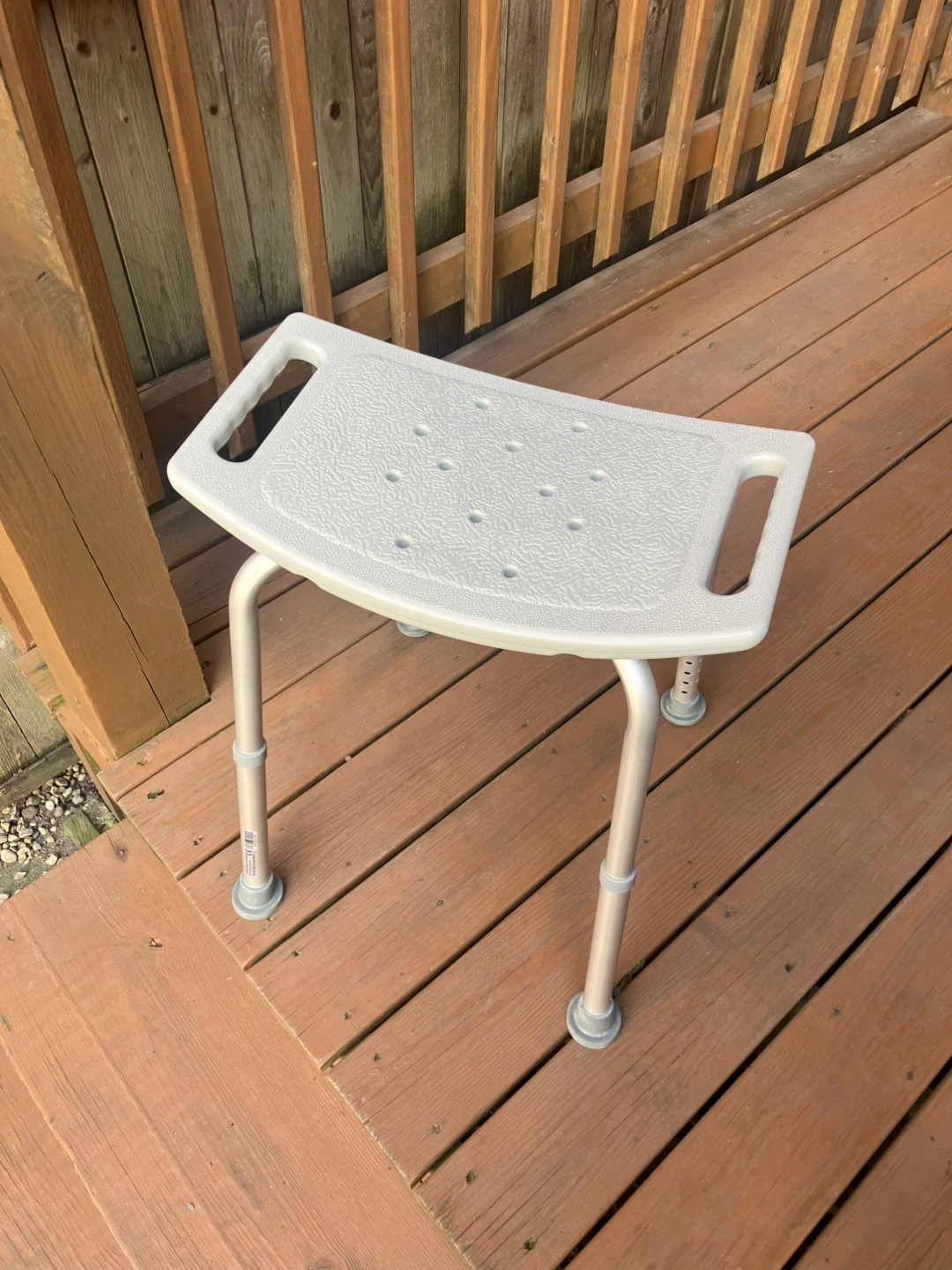 Deluxe Aluminum Shower Bench - Excellent Condition Bench and legs are in excellent condition. Rubber feet show some wear but function perfectly. Weight capacity 300 lbs. Drainage holes in bench reduce slipping. Aluminum fame is lightweight, durable and corrosion proof. Legs are height adjustable in 1" increments, and angled with suction-style tips to provide additional stability. Made using recycled materials. From a smoke and pet free home. Check out in person before purchasing. Thanks for looking.