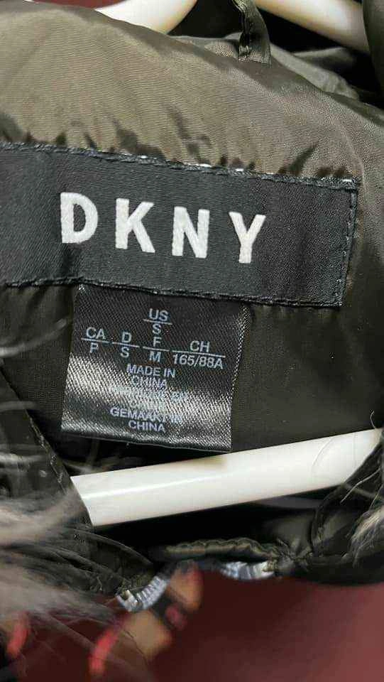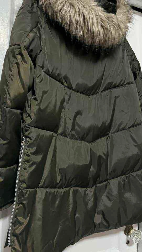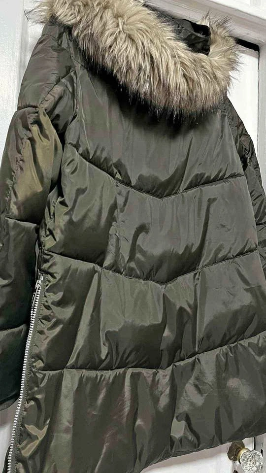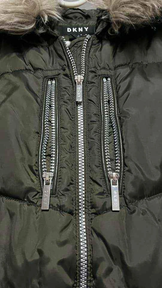 Used Twice /Like New DKNY Faux Fur Hood Green Winter Jacket 4 Pockets in Front Very Warm Jacket. Excellent Condition
