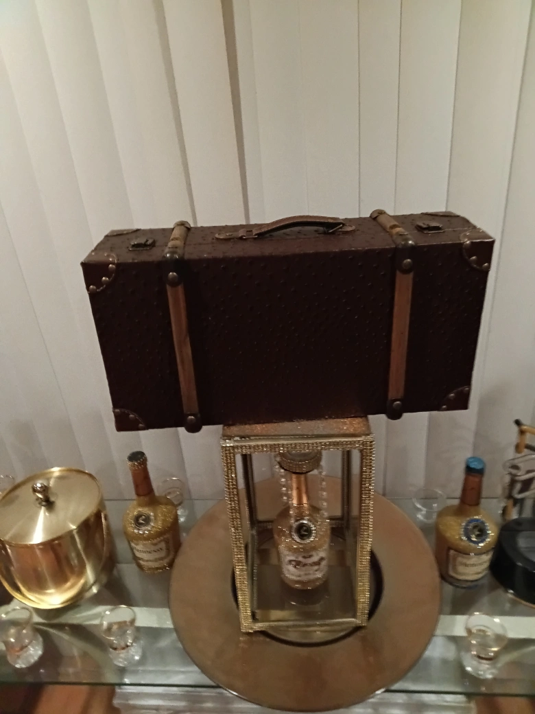 I'm selling a vintage-style decorative suitcase. It's a great piece for adding a touch of old-world charm to your home decor. The suitcase features a brown exterior with a textured pattern and antique-looking hardware. It's perfect for storage or as a unique decorative accent