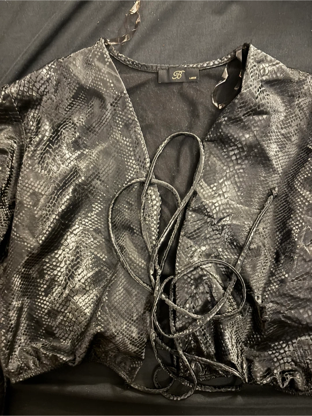 Selling a stylish black snake print two-piece set! The set includes a long-sleeve crop top and a matching skirt. The top features a tie-front detail, and the skirt has a slit. Both pieces are size large and have a unique snake print pattern