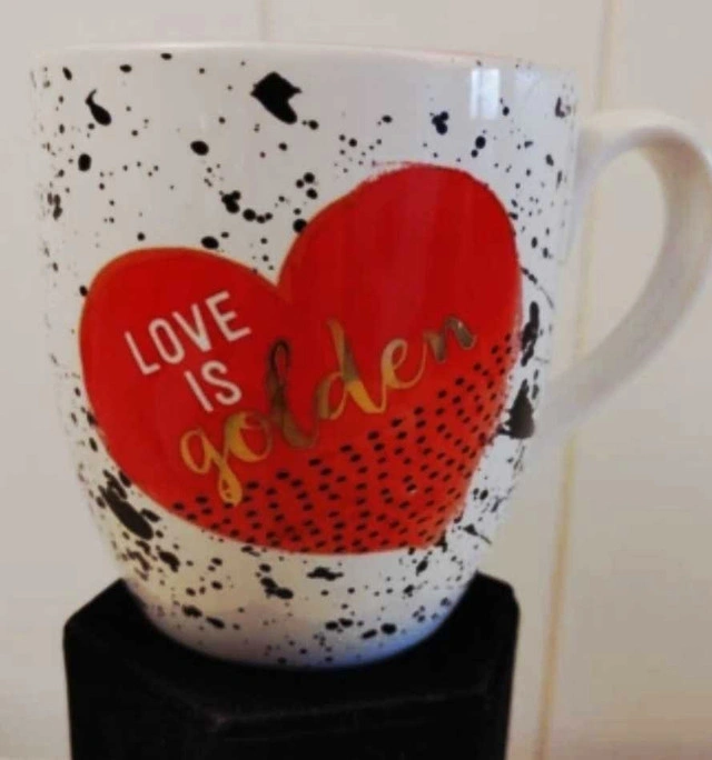 Add a touch of love to your morning coffee with this set of two 'Love is Golden' mugs. These mugs feature a unique design with a heart and gold lettering, perfect for Valentine's Day or any day you want to spread a little love. They are NEW and ready to brighten up your kitchen. Great gift from Hallmark and Artist Jill Scott If the ad is up, they're available!