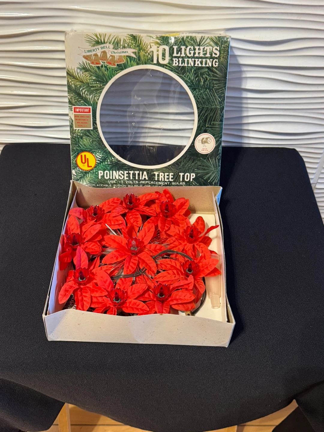 Selling a vintage Liberty Bell Poinsettia Tree Top with 10 blinking lights! This charming decoration comes with its original box and features bright red poinsettias. It uses 13-volt replacement bulbs, and the design ensures that if one bulb goes out, the rest stay lit. Perfect for adding a retro touch to your Christmas tree