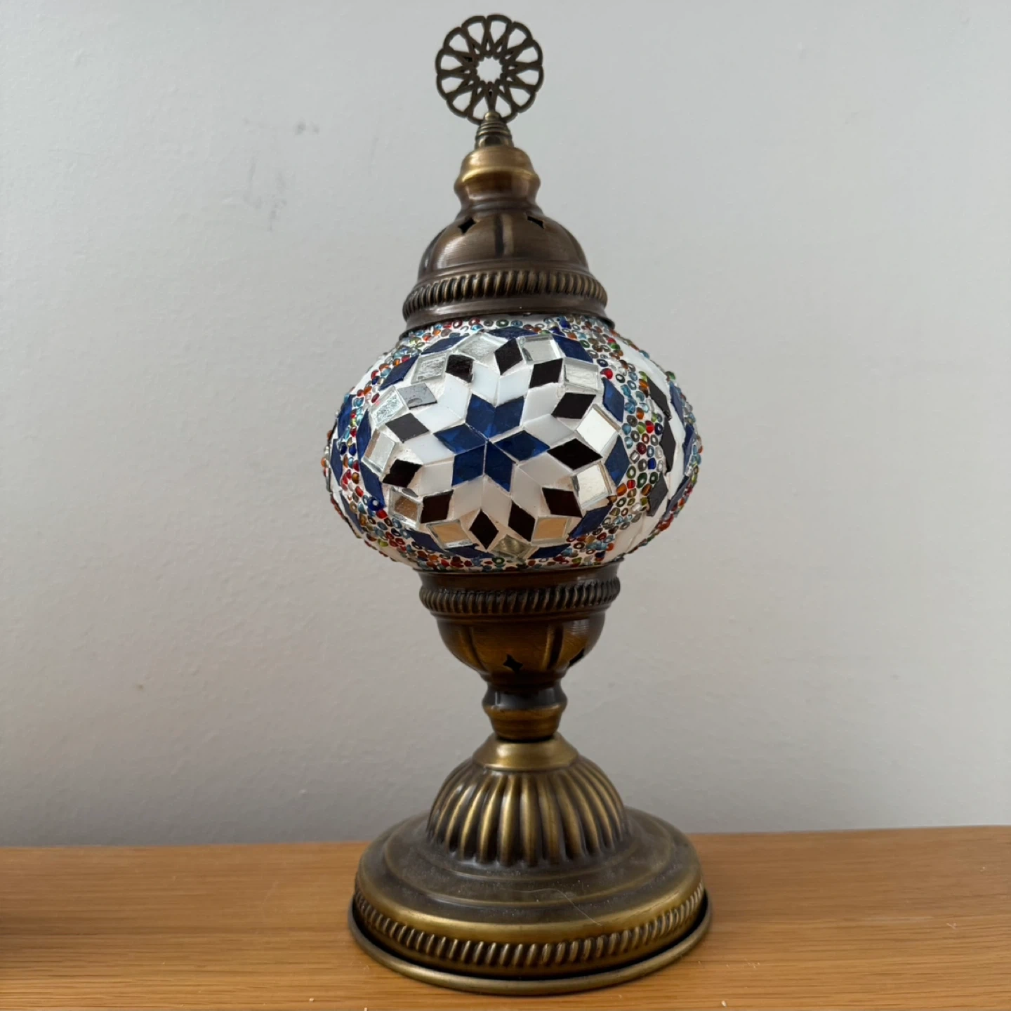 Here is a beautiful mosaic Turkish lamp! It has a colorful glass design and a unique look. It would be a great addition to any room.