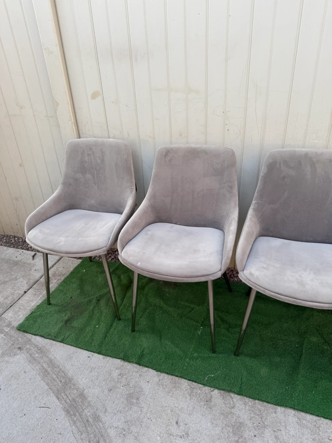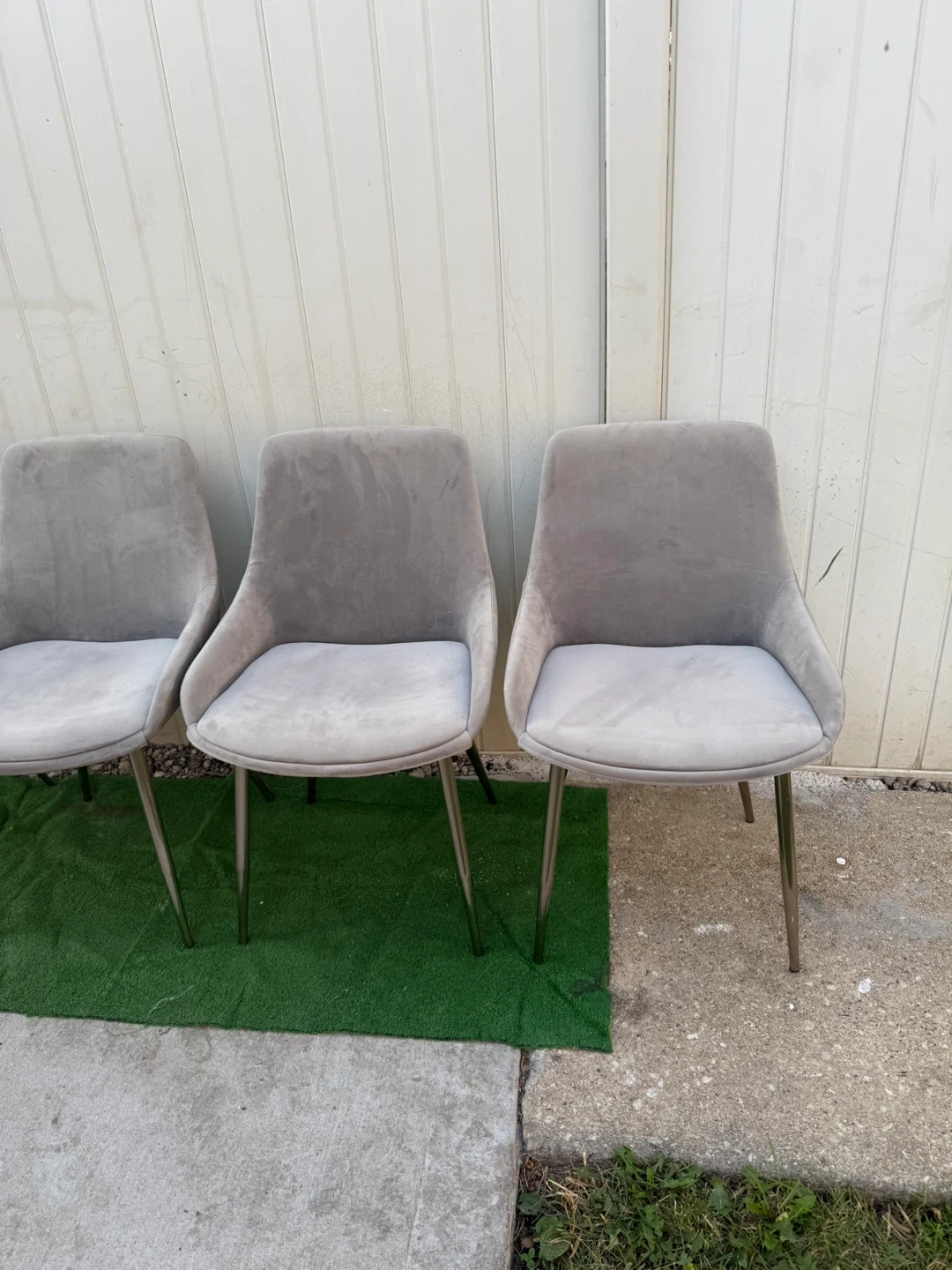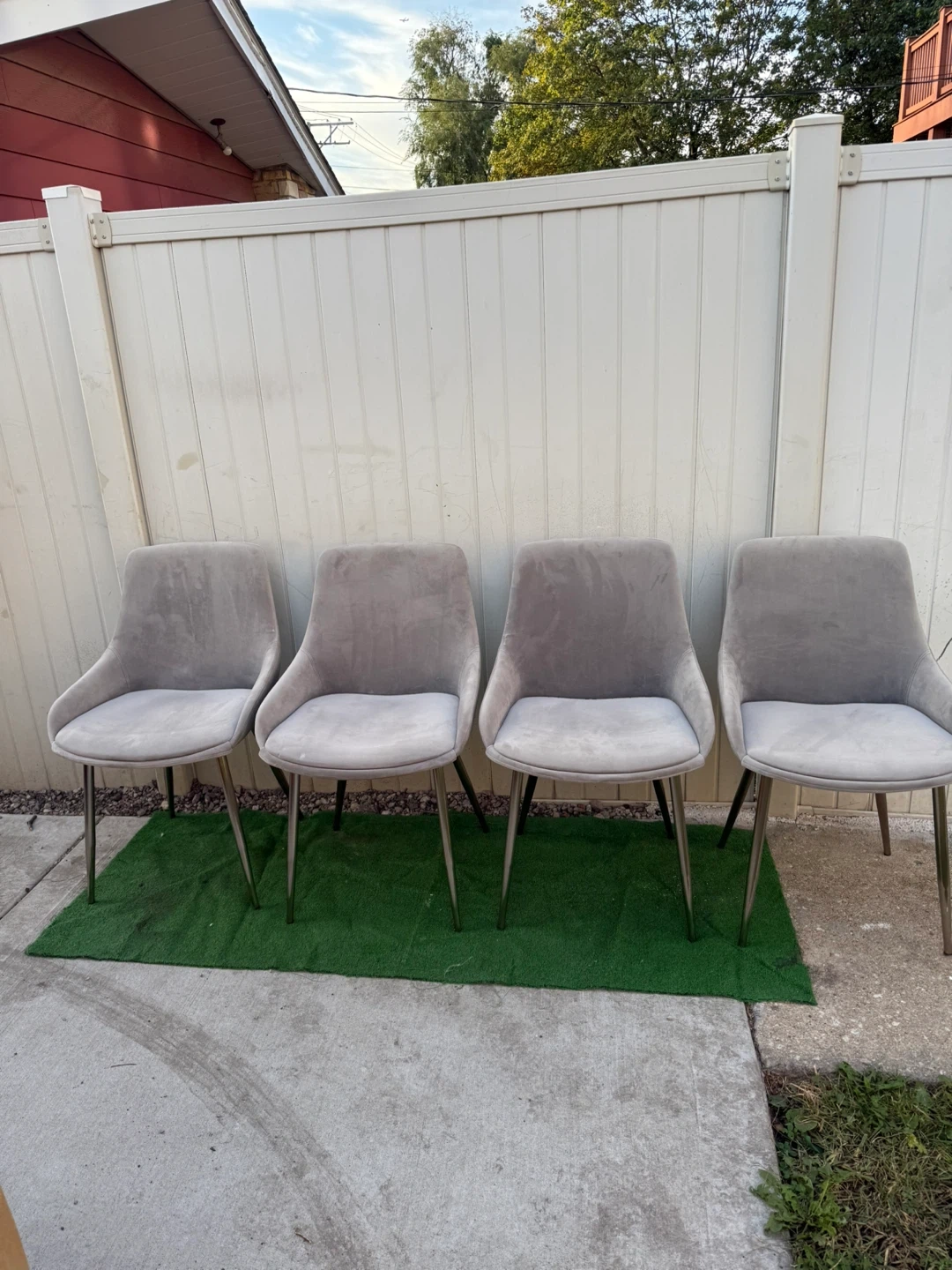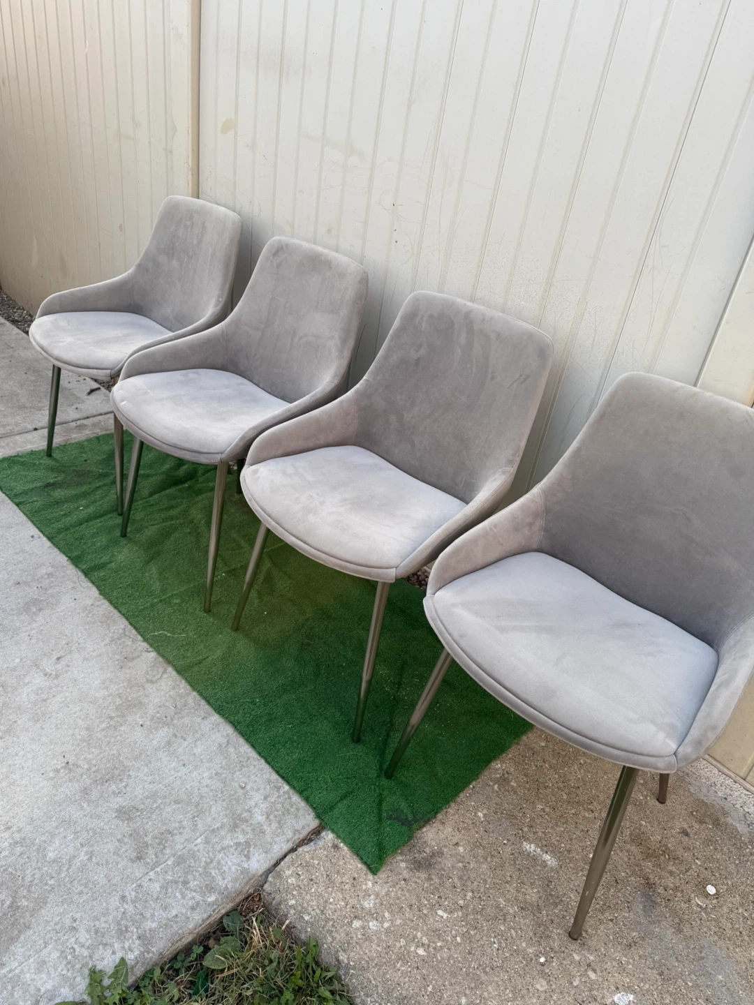 Selling a set of four stylish dining chairs! They feature a soft gray velvet upholstery and sleek metal legs. These chairs would look great in any dining room or kitchen space. They are in good condition and ready for a new home