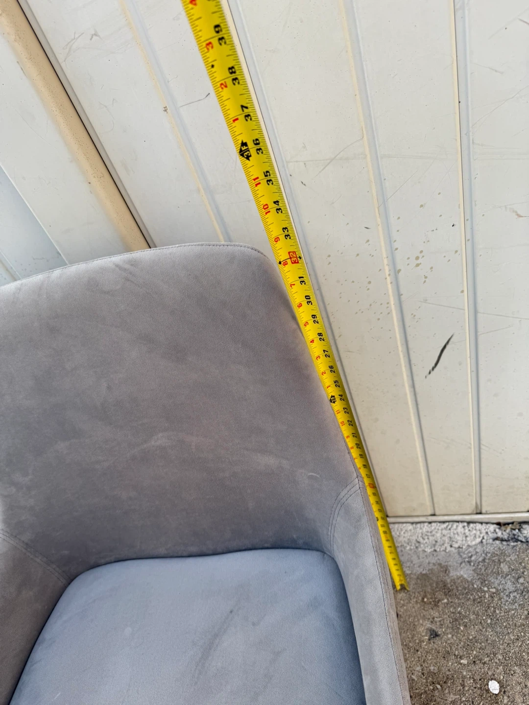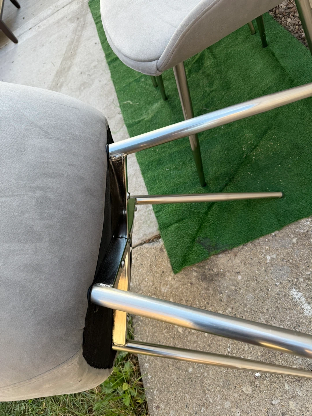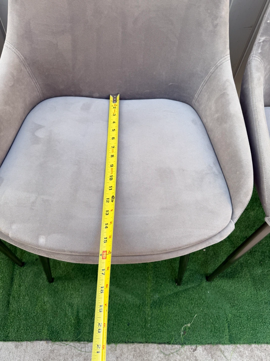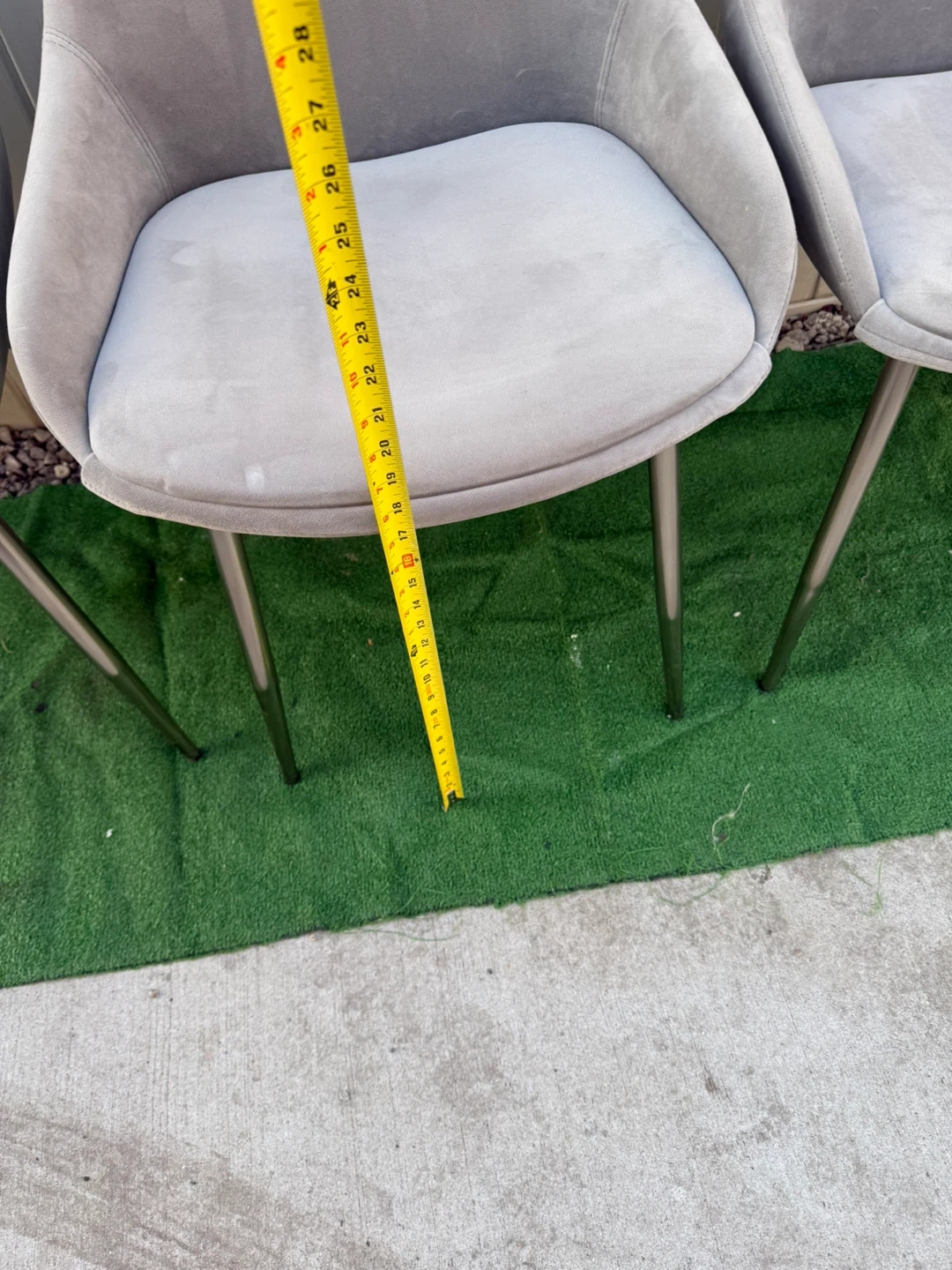 Selling a set of four stylish dining chairs! They feature a soft gray velvet upholstery and sleek metal legs. These chairs would look great in any dining room or kitchen space. They are in good condition and ready for a new home