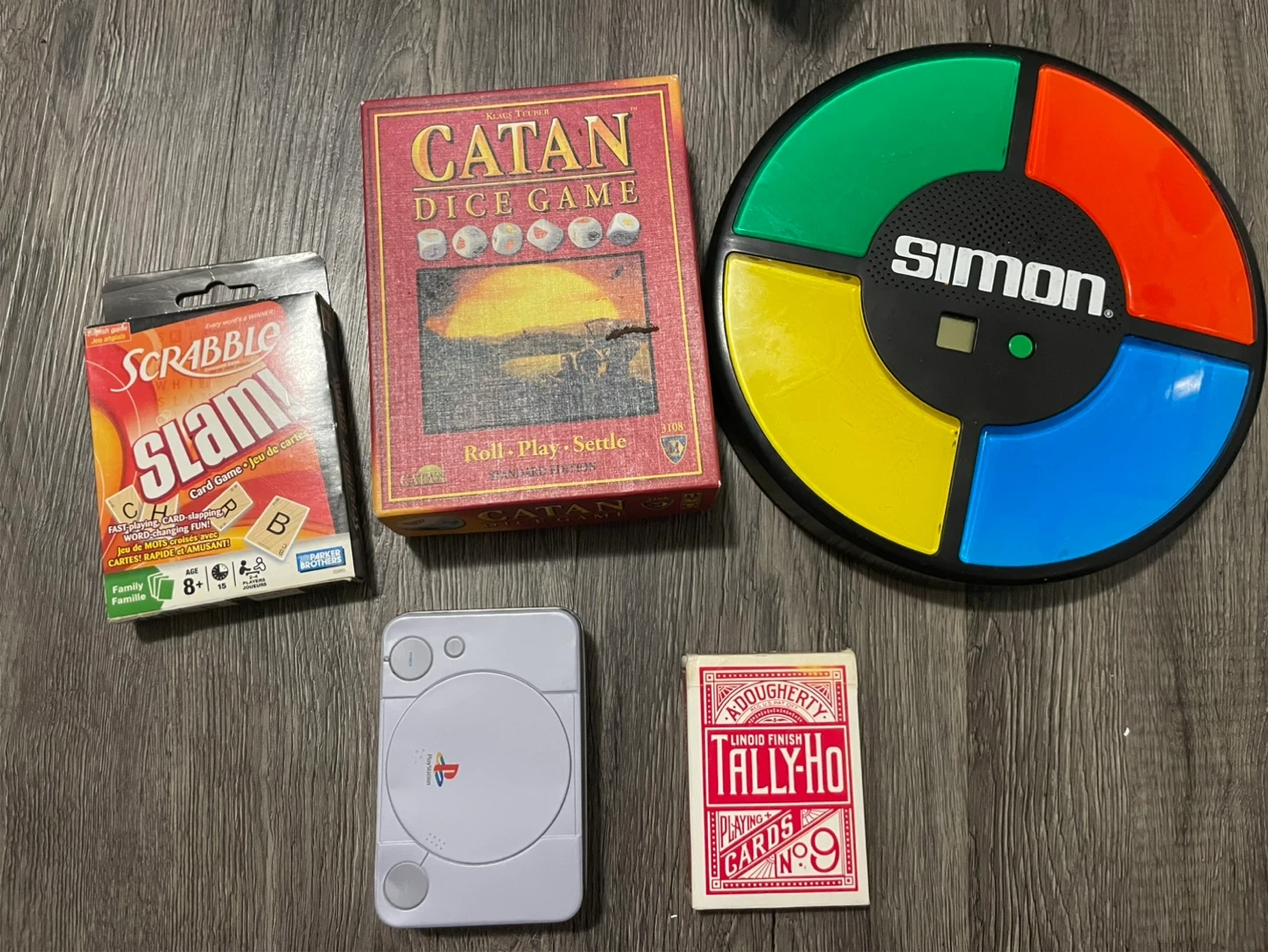 Selling a collection of fun board games! Includes: - Simon game - Catan Dice Game - Scrabble Slam! card game - Tally-Ho Playing Cards